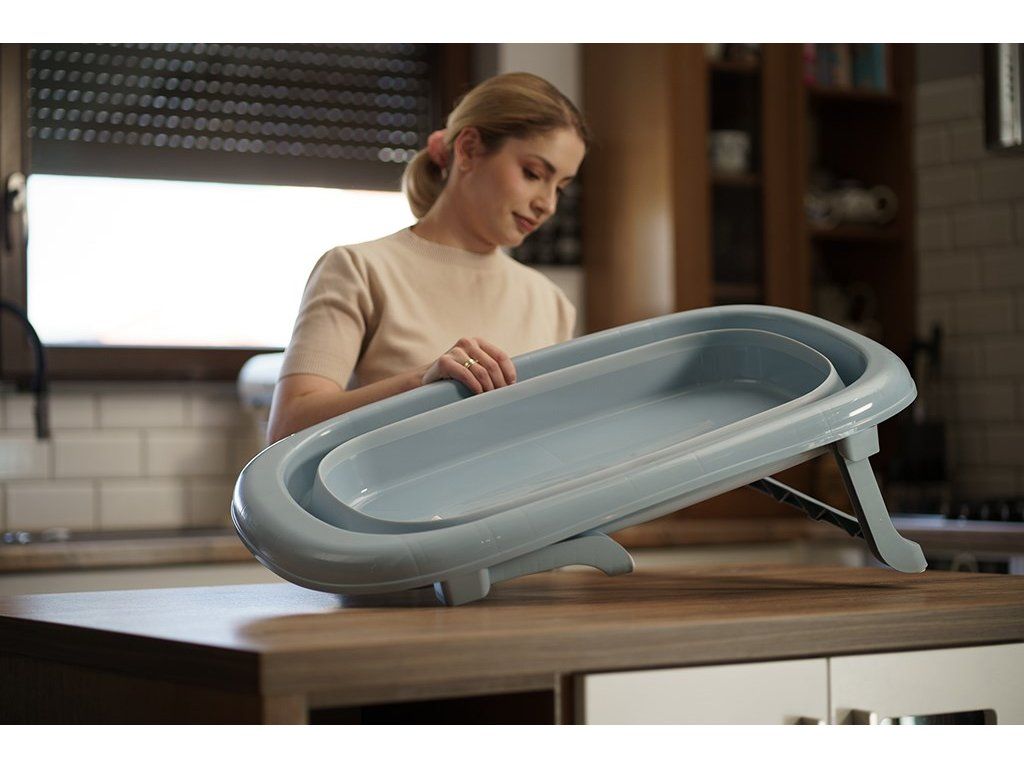 Vanička je vybavená výpustným ventilom a pásikovým teplomerom, čo výrazne zvyšuje komfort a bezpečnosť pri každodennom používaní. Dá sa jednoducho zložiť na výšku len 10 cm, pričom plastové nožičky sa sklopia priamo pod vaničku – vďaka čomu zaberá minimum miesta a je ideálna na skladovanie aj v menších priestoroch.