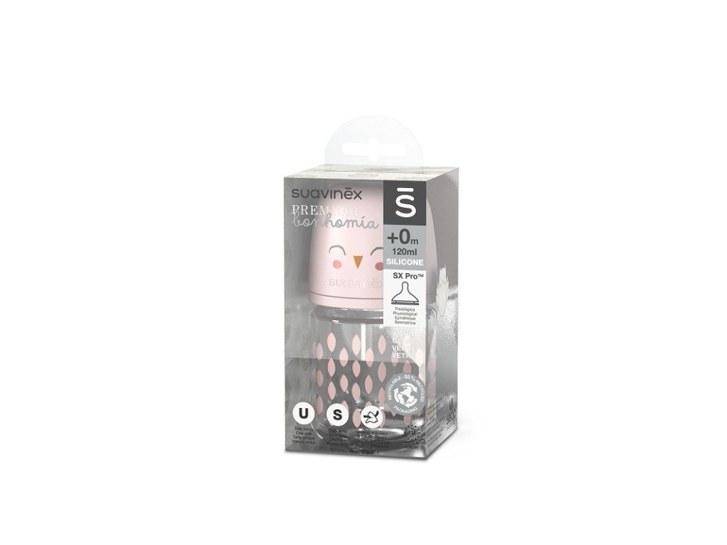 SUAVINEX | Fľaša sklo BONHOMIA 120 ml fyziologická SX PRO +0 SF - ružová