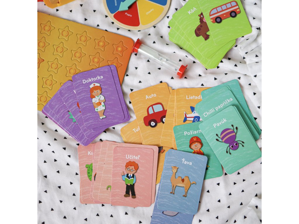 Hádaj, kto som! SK Obľúbená hra pre celú rodinu Hádaj, kto som! je zábavná rodinná hra, ktorá prináša veľa smiechu a rozvíja detské schopnosti. V tejto hre sa jeden hráč postaví do úlohy hádajúceho a ostatní hráči mu ukazujú, čo sa skrýva na jeho čele, a to buď pantomímou, otázkami, alebo opisovaním. Hráč sa pokúša uhádnuť, čo na jeho čele je – môže to byť lietadlo, žabka, kačka či kravička. Hra má až 60 kariet, ktoré ponúkajú množstvo rôznych zvieratiek a predmetov na hádanie.Rodinná hra, kde je dôležitý čas, otázky a správne tipy Súčasťou balenia sú aj presýpacie hodinky a bodovacie hviezdičky, ktoré vám umožnia hrať rôzne verzie, od jednoduchej po zložitejšiu. Hádaj, kto som! je skvelá hra na rozvoj detskej slovnej zásoby, rečových schopností a interakcie s ostatnými. Deti sa učia klásť otázky, komunikovať, a aj efektívne spolupracovať s ostatnými hráčmi. Všetko je vyrobené z kvalitných materiálov s dôrazom na životné prostredie a bezpečnosť. Hra je v slovenskom jazyku.Tu nájdete návod