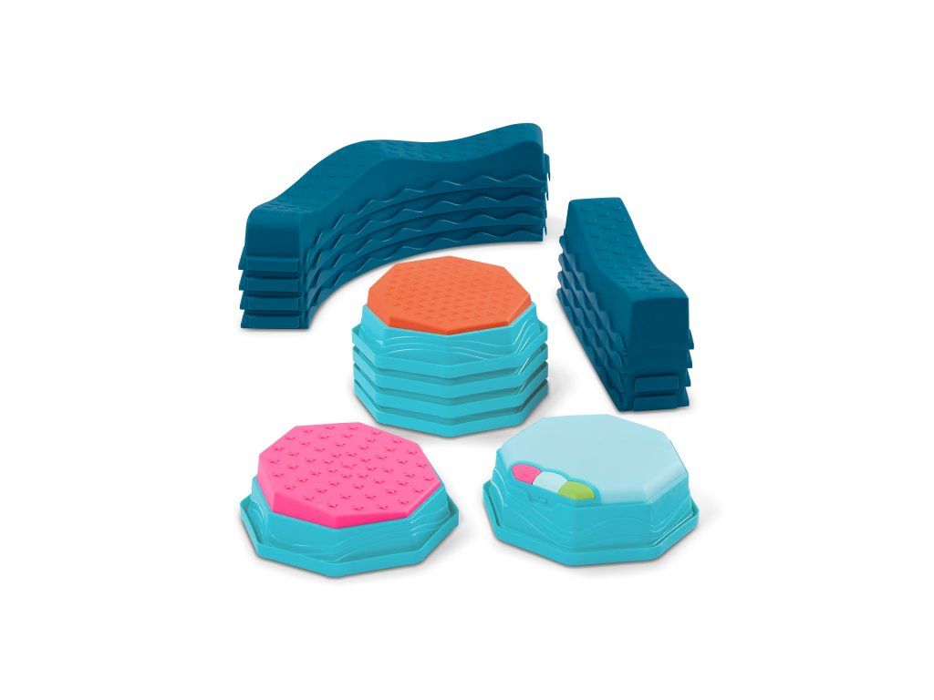 - Modulárna balančná dráha – 4 vlnité prekážky, 4 rovné prekážky a 5 senzorických stupienkov umožňujú nekonečné kombinácie a variabilné stavby