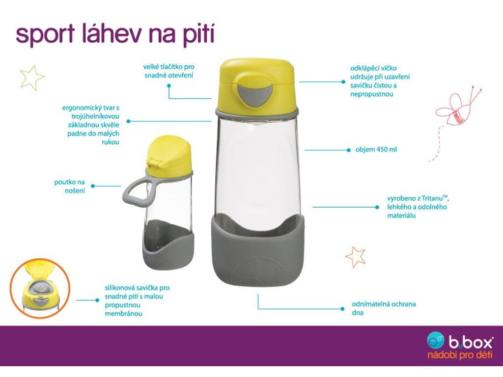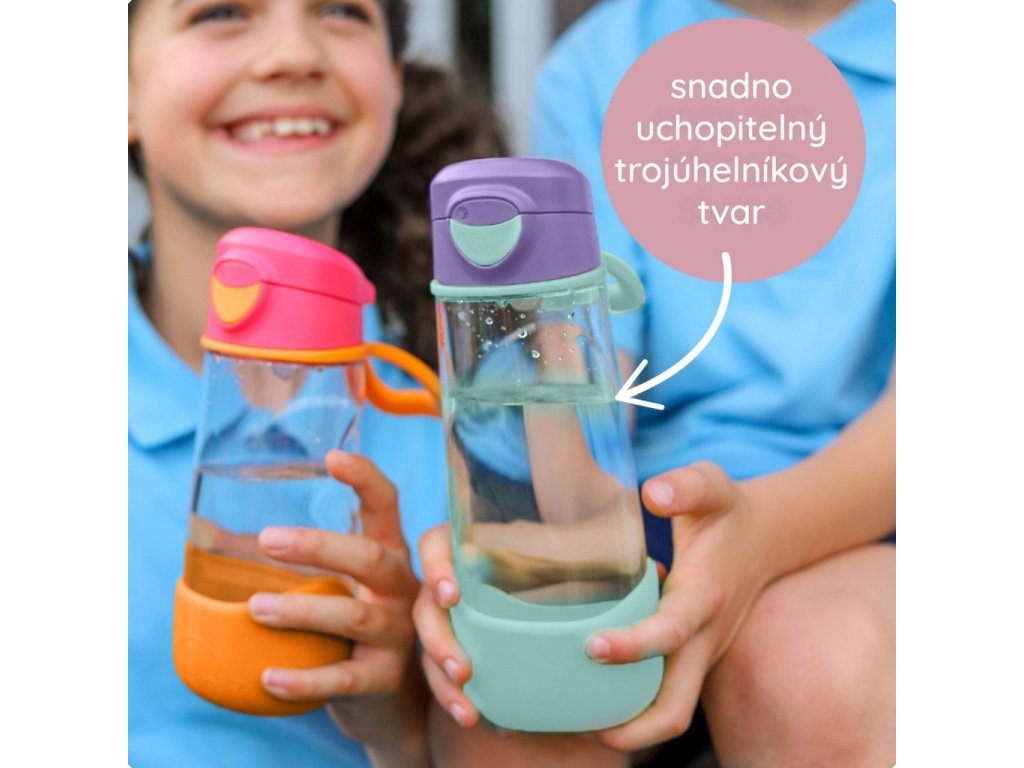 Už sú veľkí na hrnček so slamkou a malá fľaštička nezaženie ich smäd? Austrálska značka b.box má pre nich bezchybnú ergonomickú fľaštičku s trojuholníkovou základňou, pútkom a silikónovým náustkom! Do škôlky aj do školy, na ihrisko aj na výlety, túto ľahkú tritánovú fľaštičku môžete mať všade so sebou. Pítko fľaštičky stačí len stlačiť medzi pery a ľahko sať. Viečko fľaštičky je opatrené tlačidlom, po stlačení sa viečko ľahko odklopí.