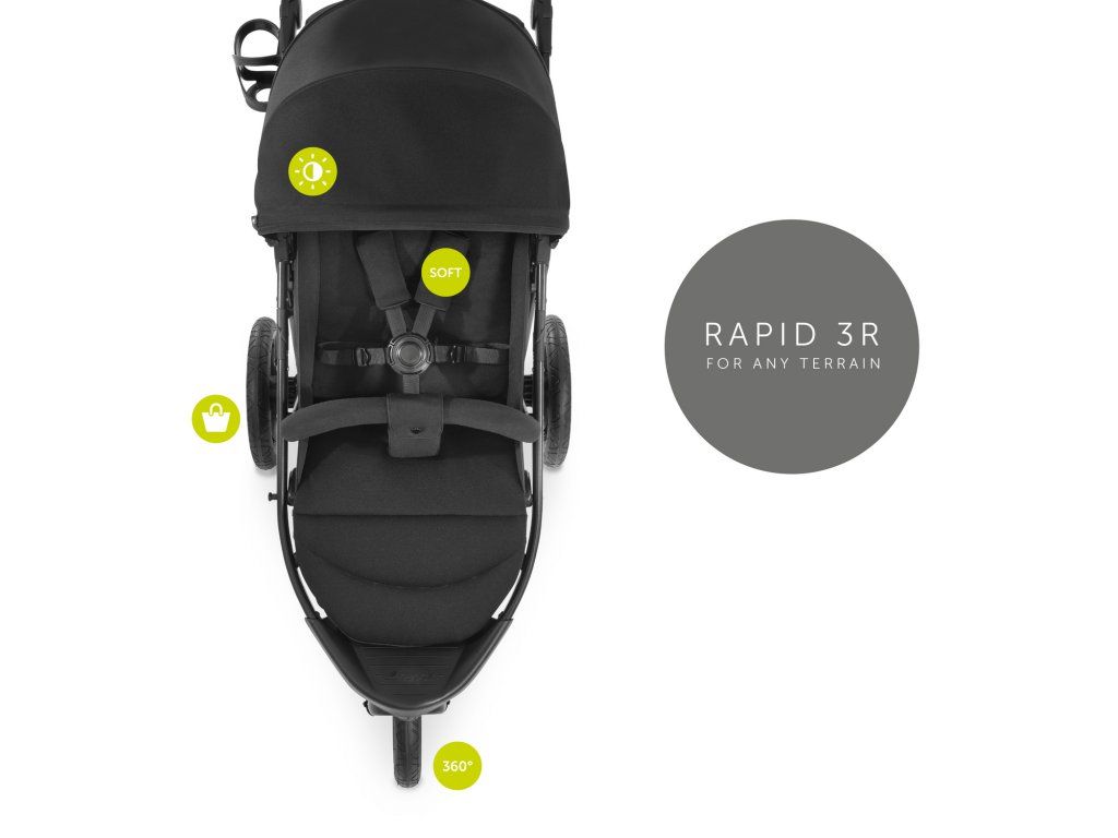 Do každého terénu // Tento terénny kočík vďaka svojim veľkým kolesám nepokazí žiadnu zábavu. Vysoko kvalitný gumový profil kolies skvele odpruží nerovnosti na cestách a nehrozí Vám s nimi defekt. Predné koleso je otočné a v prípade potreby zabezpečiteľné a robí tak z Rapid 3R šikovného parťáka.