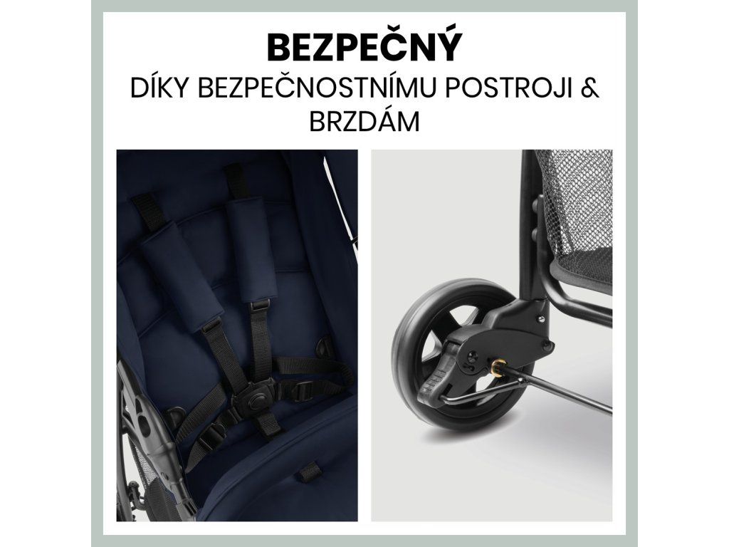 Predné madlo a 5bodový polstrovaný bezpečnostný pás zaručí bezpečnosť Vášho dieťaťa. Kočík pri zastavení spoľahlivo zaistí parkovacia brzda. Tento model je možné kompaktne zložiť a uložiť aj do toho najmenšieho kufra automobilu.