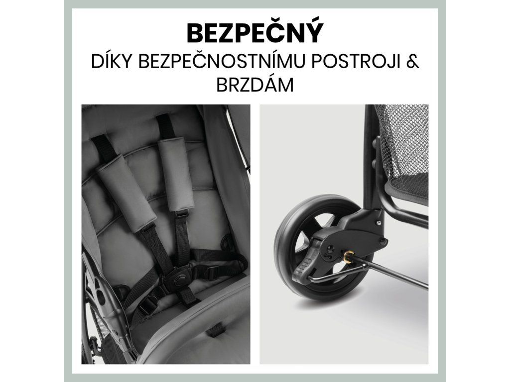 Predné madlo a 5bodový polstrovaný bezpečnostný pás zaručí bezpečnosť Vášho dieťaťa. Kočík pri zastavení spoľahlivo zaistí parkovacia brzda. Tento model je možné kompaktne zložiť a uložiť aj do toho najmenšieho kufra automobilu.