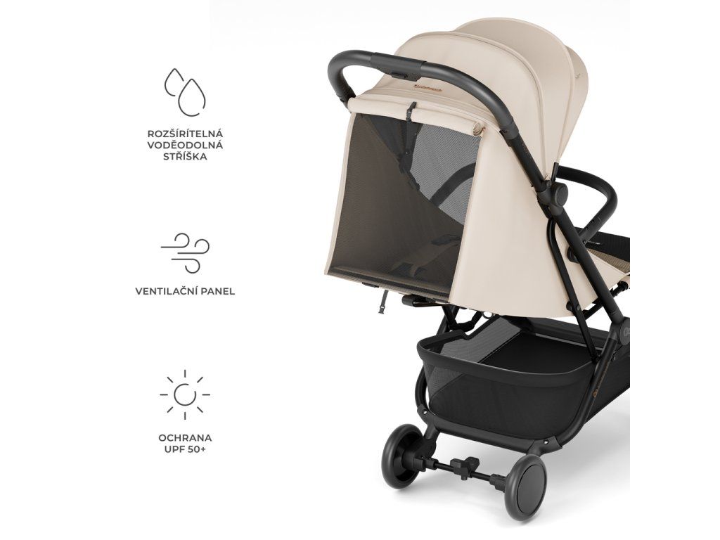 Nepremokavá strieška vyrobená z materiálu UPF 50+ účinne chráni vaše dieťa pred slnkom a dažďom. Dá sa predĺžiť a poskytnúť tak ešte väčšiu ochranu pri meniacich sa poveternostných podmienkach. Dodatočný ventilačný panel zlepšuje cirkuláciu vzduchu a umožňuje sledovanie vášho dieťaťa.