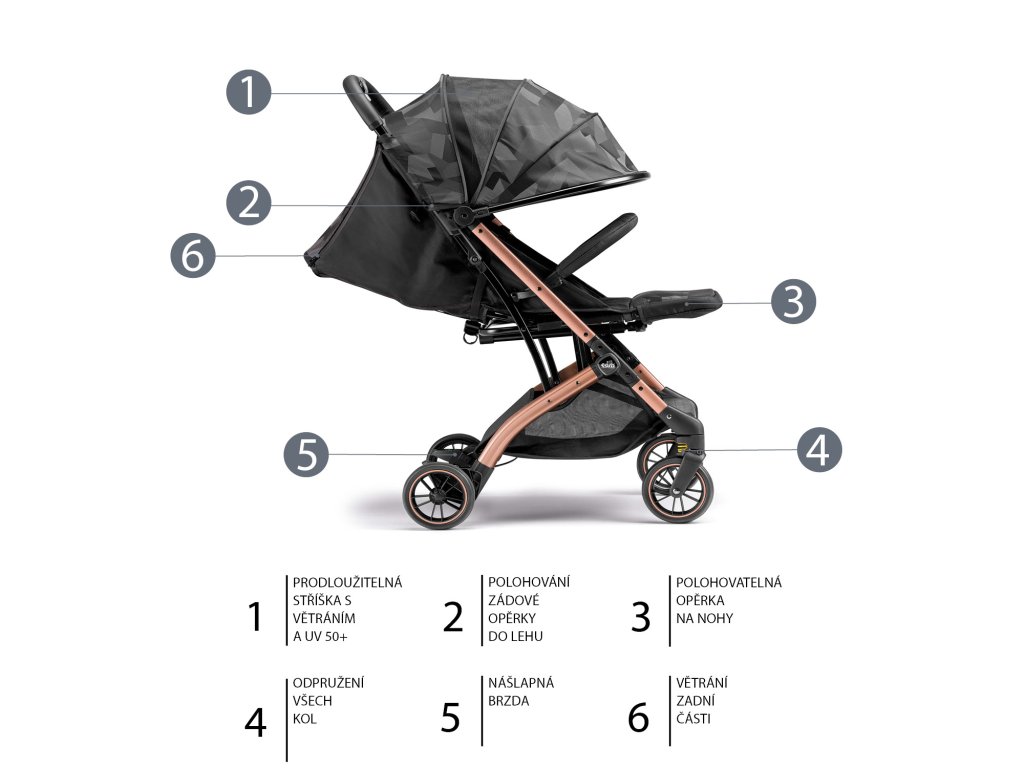 Opierku chrbta možno sklopiť do polohy ležmo a nastaviteľná je aj opierka nôh. Počas letných dní príde vhod rozťahovacia strieška s vetraním a ochranou proti slnku UV 50+. Priestor medzi strieškou a operadlom je tiež vetraný.