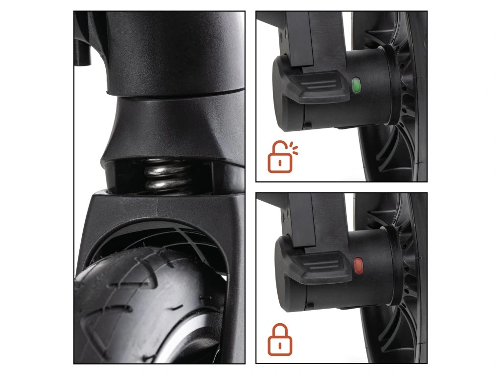 ODOLNÉ KOLESÁ A EXTRA MÄKKÉ ZAVESENIE // Či už v meste alebo na vidieku: s robustným hliníkovým rámom, veľkými odolnými gumovými kolesami a 4x4 zavesením ste dobre pripravení na akýkoľvek terén. Brzdový systém s farebným indikátorom vám ponúka ešte väčší komfort a bezpečnosť.