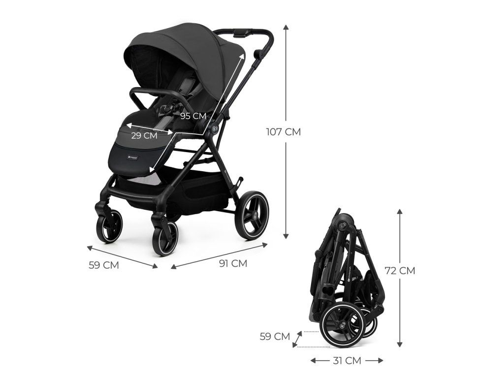 - Rozmery rozloženého kočíka: 91 D x 59 Š x 107 V