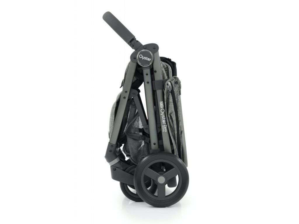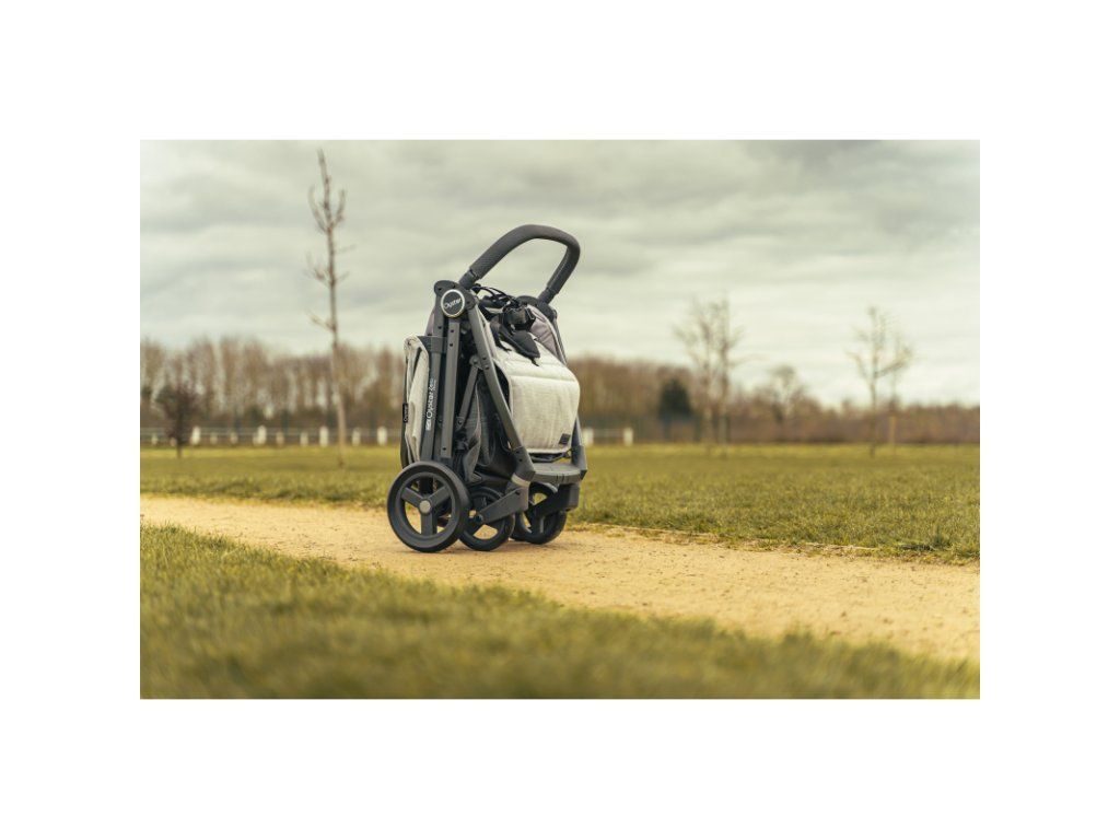 - Nové skladanie „gravity“ – po kliknutí na primárnu poistku a zošliapnutí 2 pedálov sa kočík zloží a sám stojí