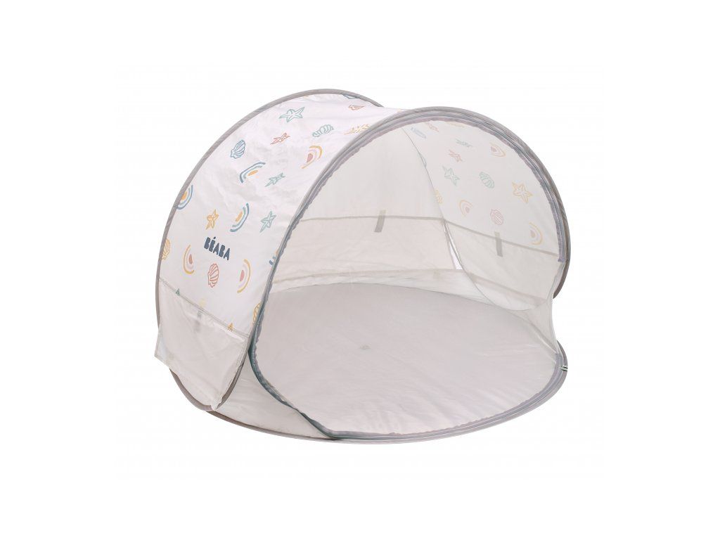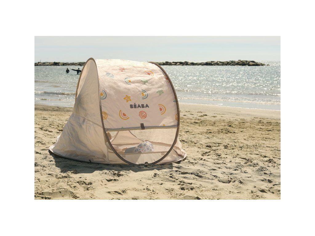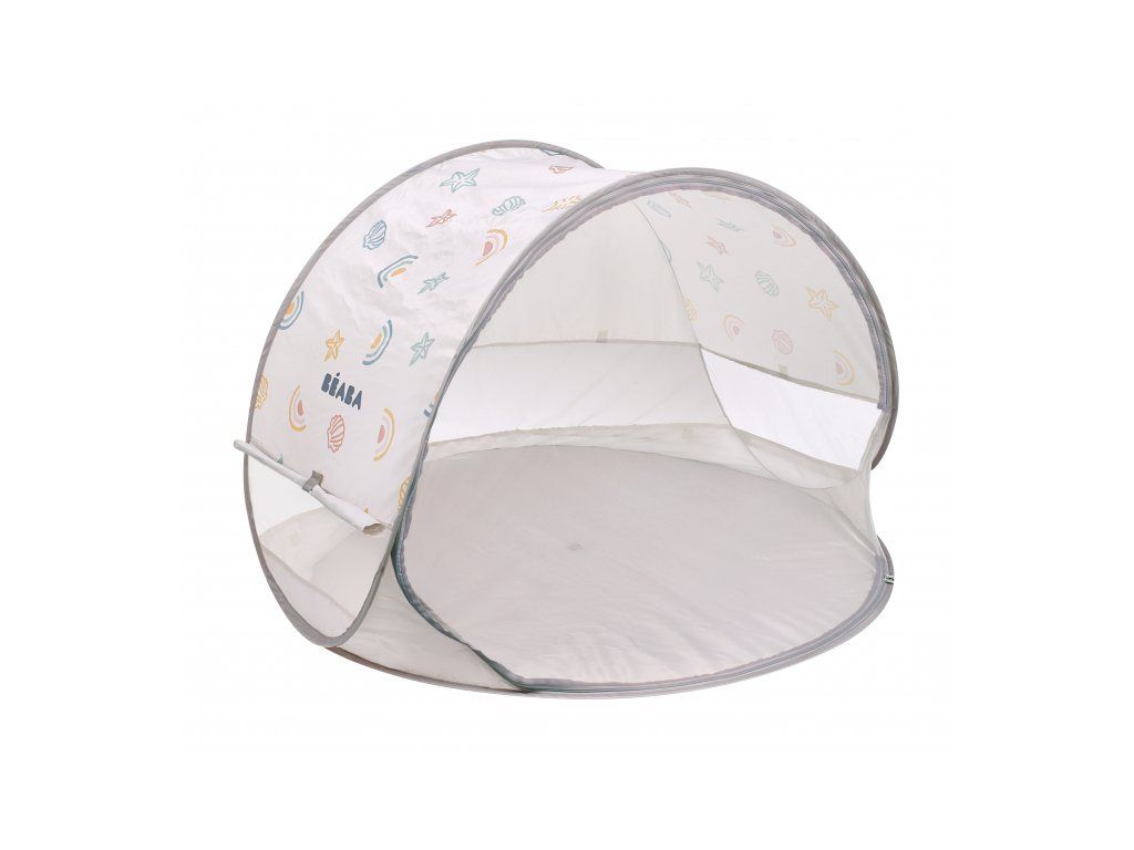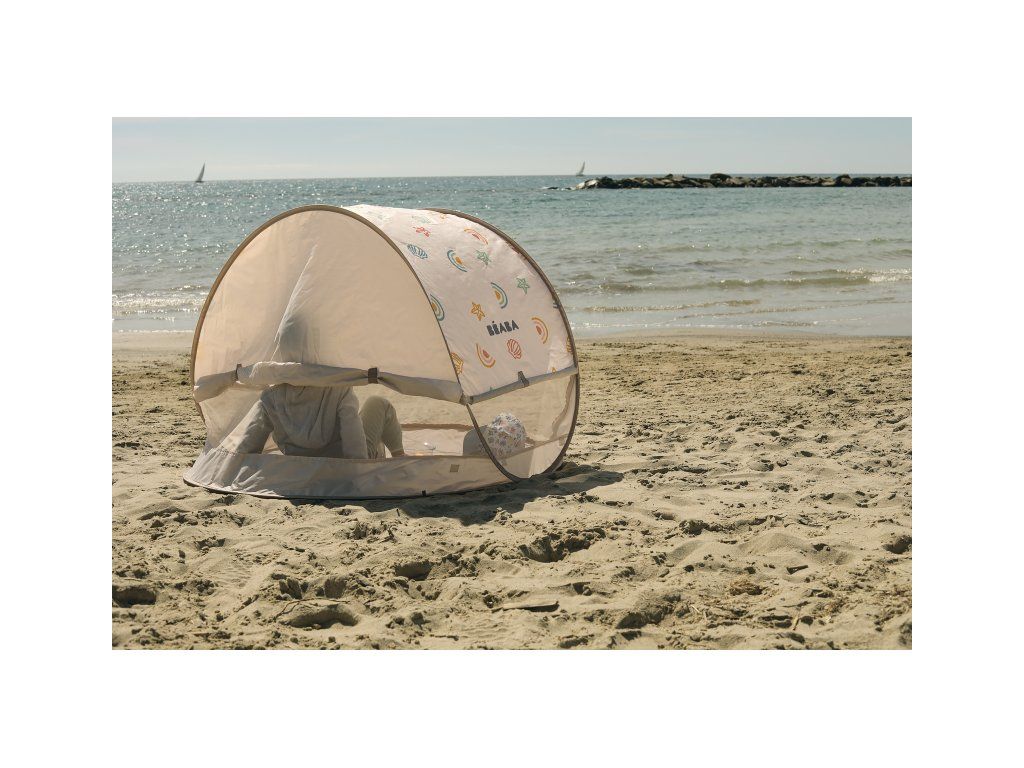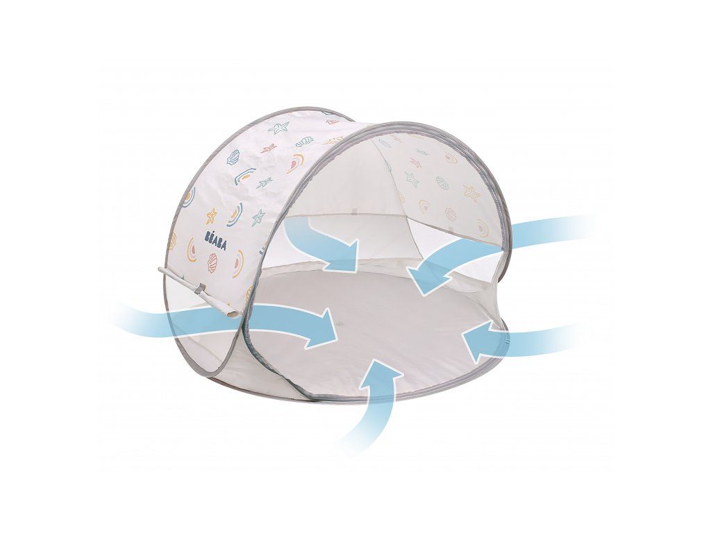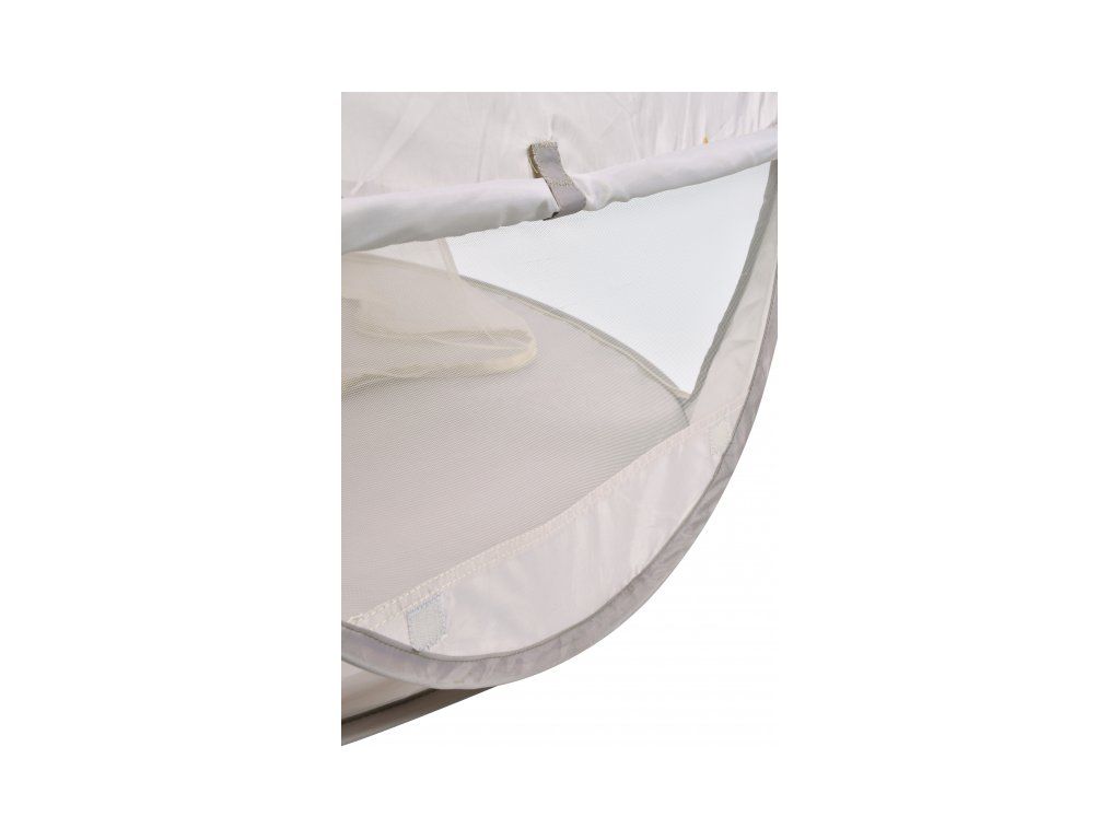 Prenosný univerzálny stan s UV faktorom 50+ na ochranu dieťaťa pred slnkom na záhrade, na pláži či na výletoch do prírody. Stan umožňuje ľahkú ventiláciu vďaka bočným otvorom so sieťovinou a textilnými chlopňami, ktoré je možné zrolovať. Sieťovina chráni dieťa v stane pred ťažkým hmyzom.