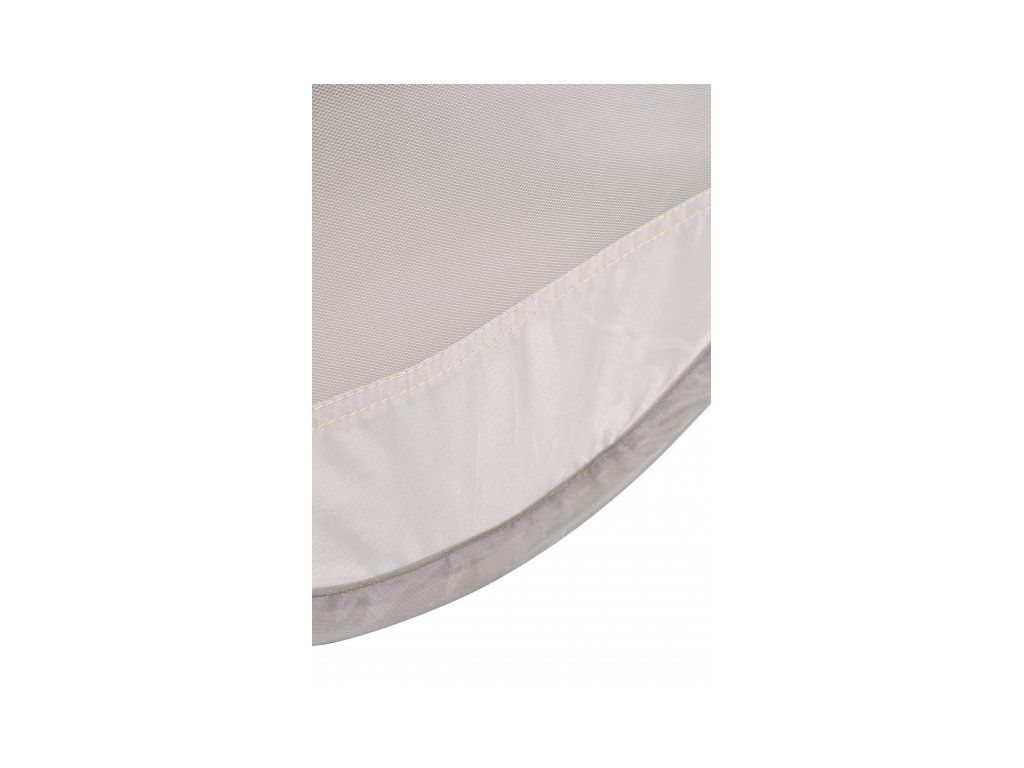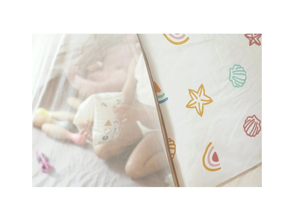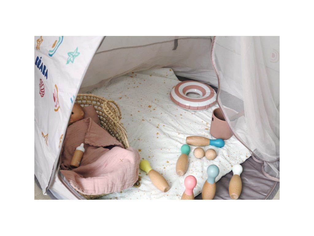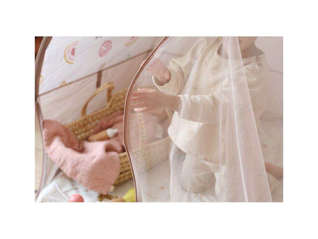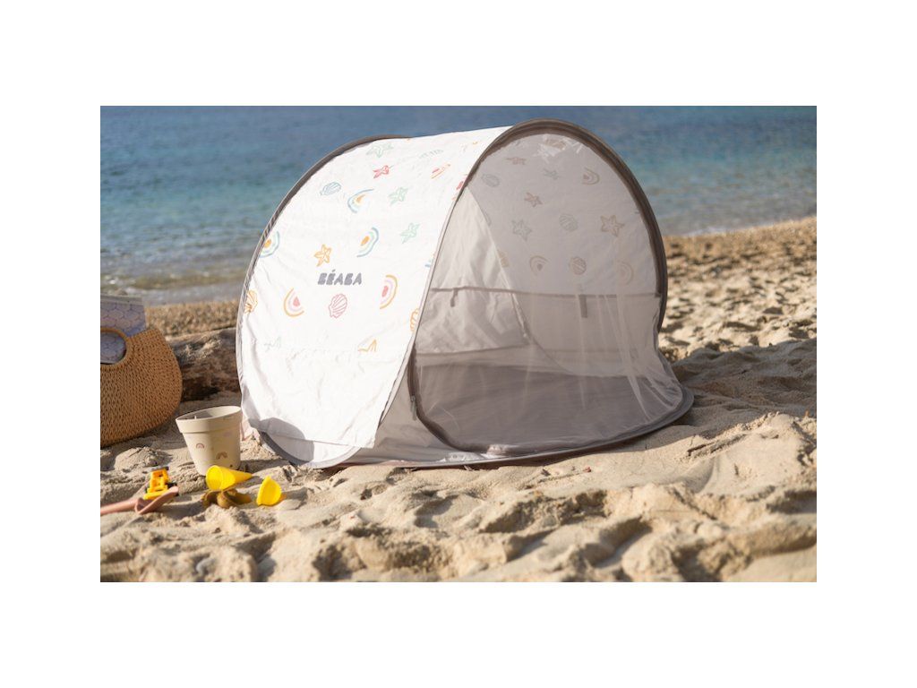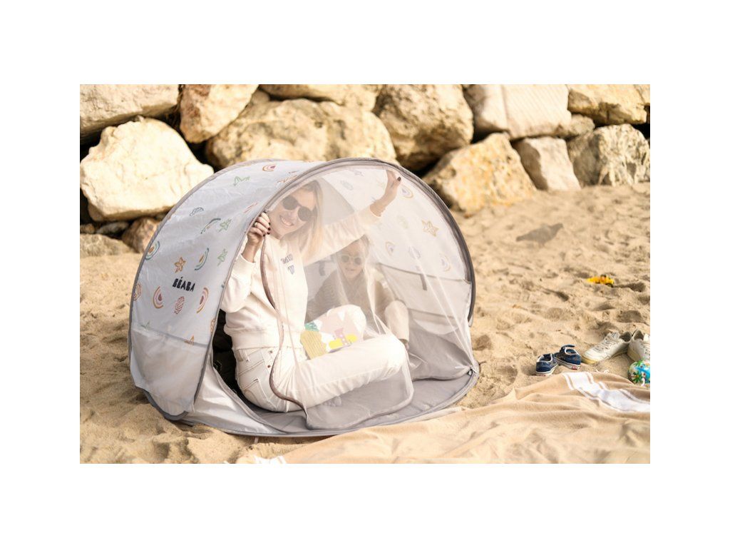 Prenosný univerzálny stan s UV faktorom 50+ na ochranu dieťaťa pred slnkom na záhrade, na pláži či na výletoch do prírody. Stan umožňuje ľahkú ventiláciu vďaka bočným otvorom so sieťovinou a textilnými chlopňami, ktoré je možné zrolovať. Sieťovina chráni dieťa v stane pred ťažkým hmyzom.