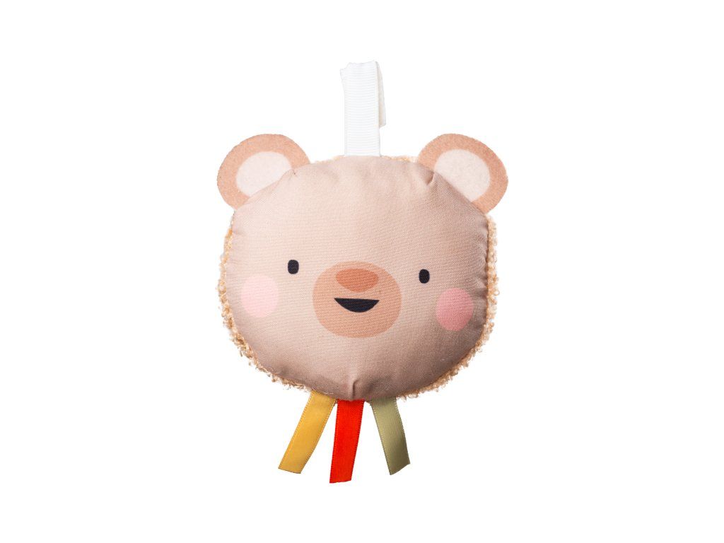 - Textilný medvedík - rozkošný cinkajúci medvedík so stužkami stimuluje hmat aj sluch a podporuje úchop aj interakciu