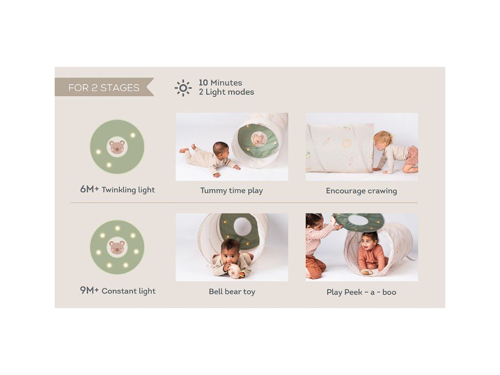 - Dva svetelné režimy - jemne blikajúci režim podporuje hru na brušku, zatiaľ čo trvalé svetlo motivuje dieťa k lezeniu tunelom, každý režim trvá 10 minút