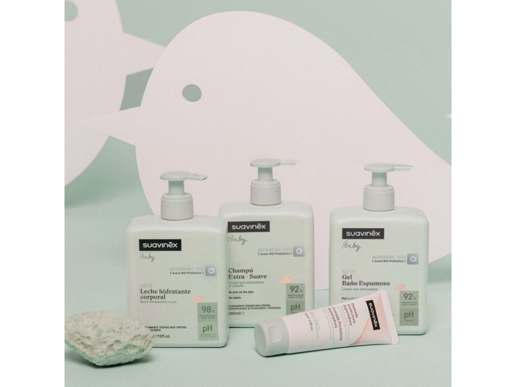 Nová řada svým složením inovované dětské pečující kosmetiky Suavinex přišla právě na pulty španělských lékáren. S jedinečným složením inspirovaným kožním mikrobiomem. Odbornost značky v péči o dětskou pokožku je zárukou úspěchu těchto čtyř produktů: Pěnový koupelový gel 300m, EXTRA jemný - šampon 300ml, Hydratační tělové mléko 300 ml a JEMNÝ koupelový krémový gel 300ml.