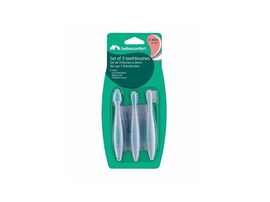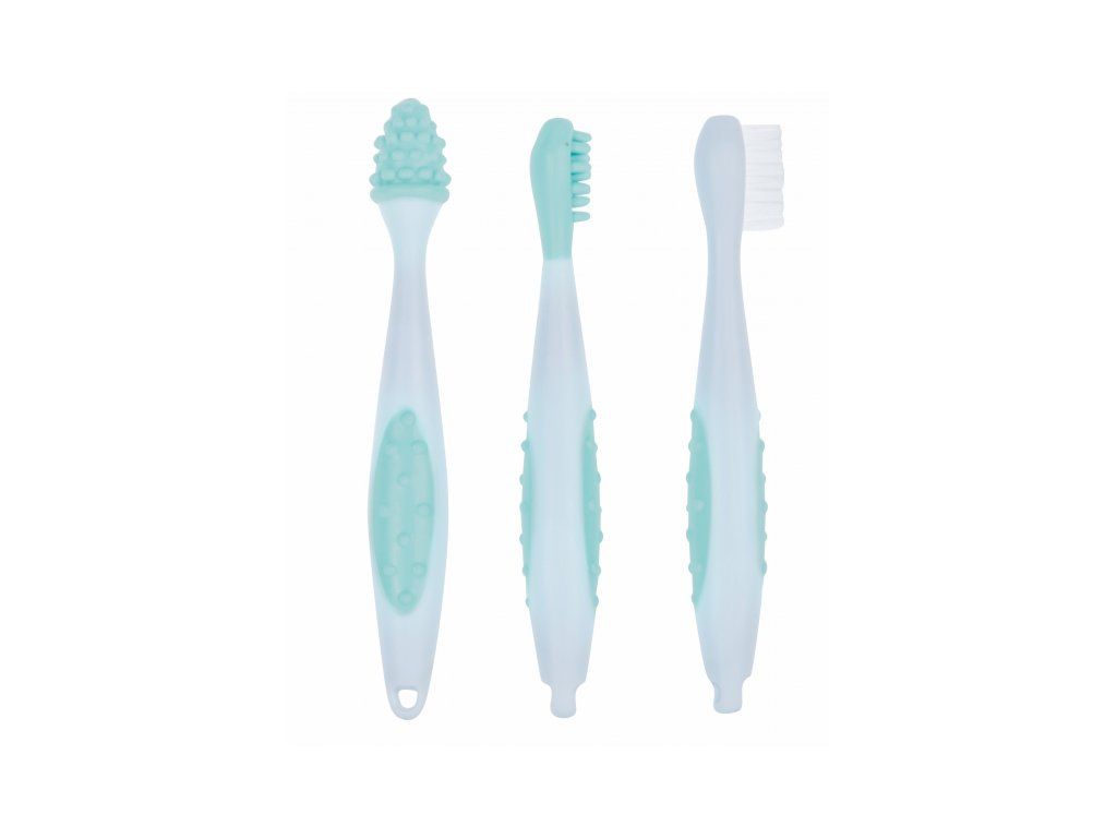 Sada obsahuje masážnu kefku pre ďasná dieťaťa pred prerezaním prvých zúbkov, masážnu kefku pre prvé zúbky a citlivé ďasná a kefku pre batoľatá na klasické čistenie zúbkov. Rukoväť kefiek umožňuje ľahké držanie.