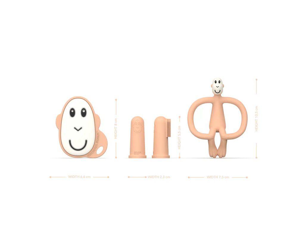 Broskyňové hryzadlo v tvare opičky je zábavné, flexibilné a vďaka textúrovaným výstupkom rýchlo zasiahne miesto bolesti. Plochí opičí kamaráti sú malí, ľahučkí a ideálni do drobných detských ručičiek – skvelí na cesty alebo do tašky. Silikónové prstové kefky sú ideálnou prvou zubnou kefkou pre bábätko – jemné a šetrné k ďasnám.