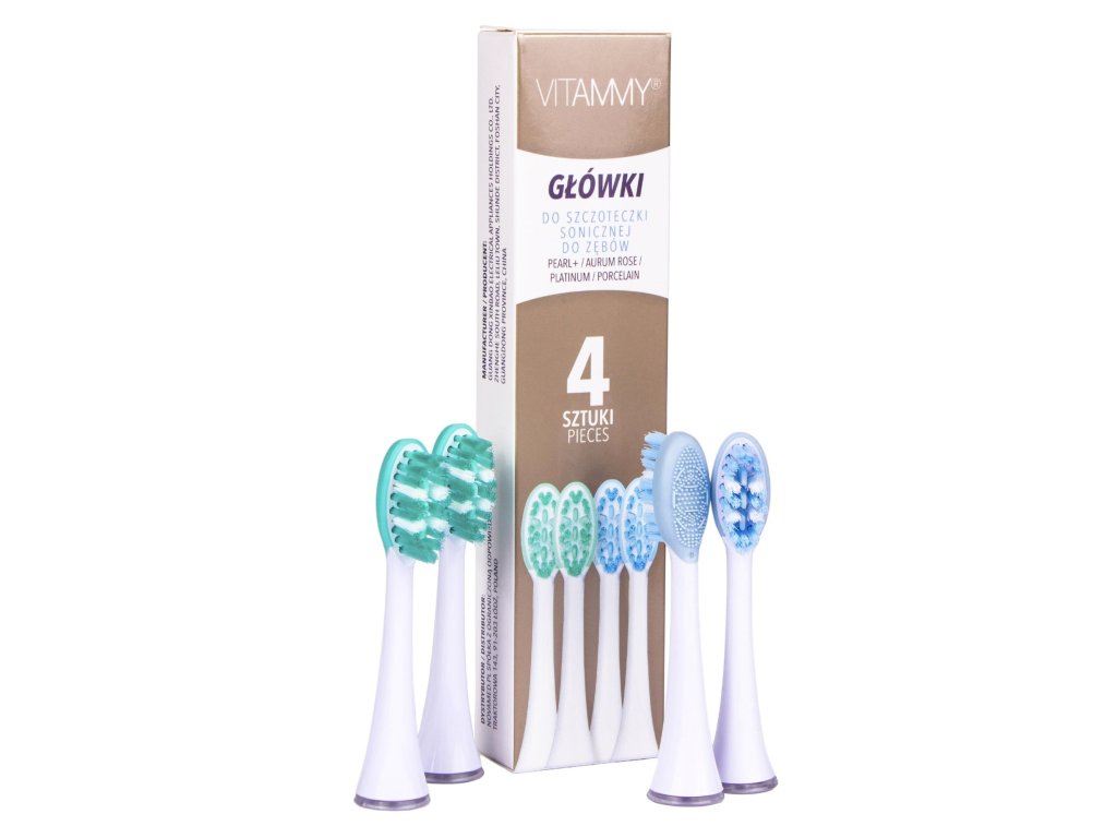 Balenie obsahuje 4 kusy náhradných násad, čo predstavuje zásobu na celý rok pri odporúčanej výmene každé 3 mesiace. Sú kompatibilné so sonickými zubnými kefkami VITAMMY PEARL+, AURUM Rose a PLATINUM.