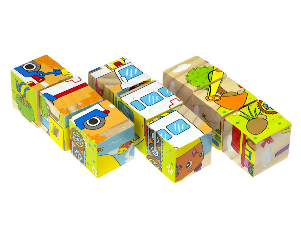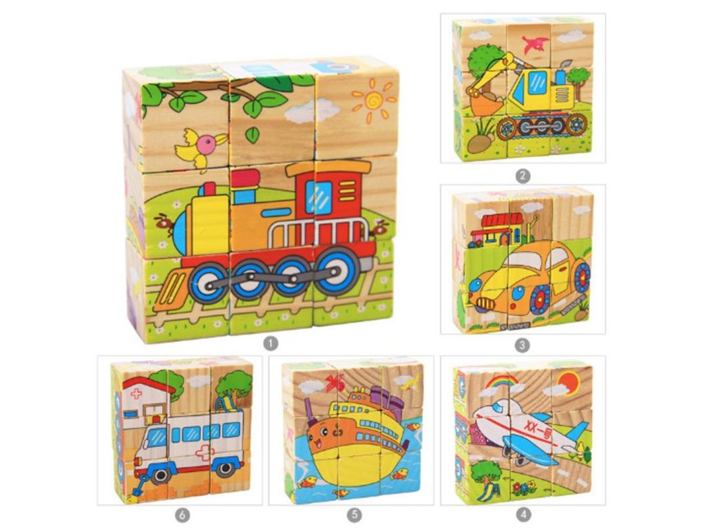 Drevené kocky, ktoré vytvárajú 6 obrázku dopravných prostriedkov - loď, vlak, bager, auto, lietadlo, sanitka. Otočením každej kocky vytvoríte iný obrázok. Ide o vzdelávaciu hru, ktorá pozitívne ovplyvňuje rozvoj logického myslenia a priestorovej predstavivosti dieťaťa.
