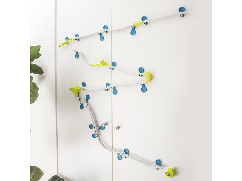 Začnite pripevnením jednotlivých segmentov dráhy na stenu alebo inú hladkú vertikálnu plochu pomocou špeciálneho gélu. Tento gél je vyrobený tak, aby pevne držal komponenty, pričom sa dá ľahko odstrániť a znova použiť bez poškodenia povrchu.