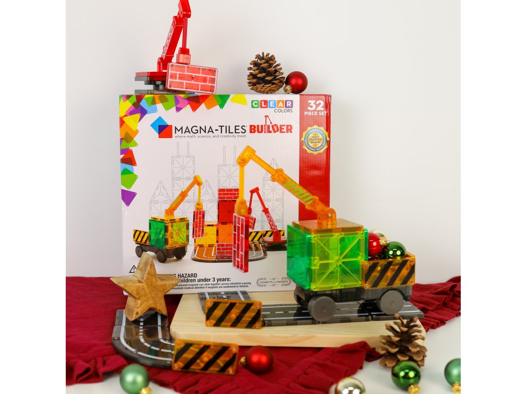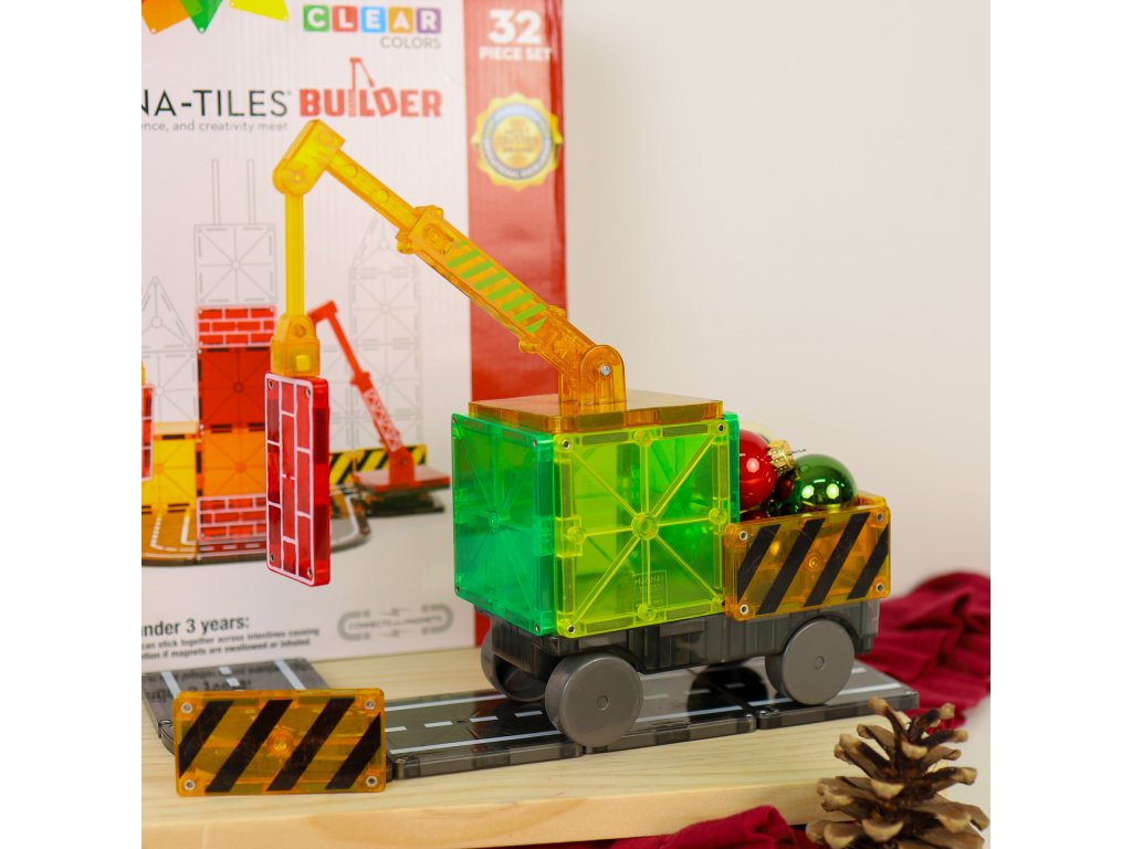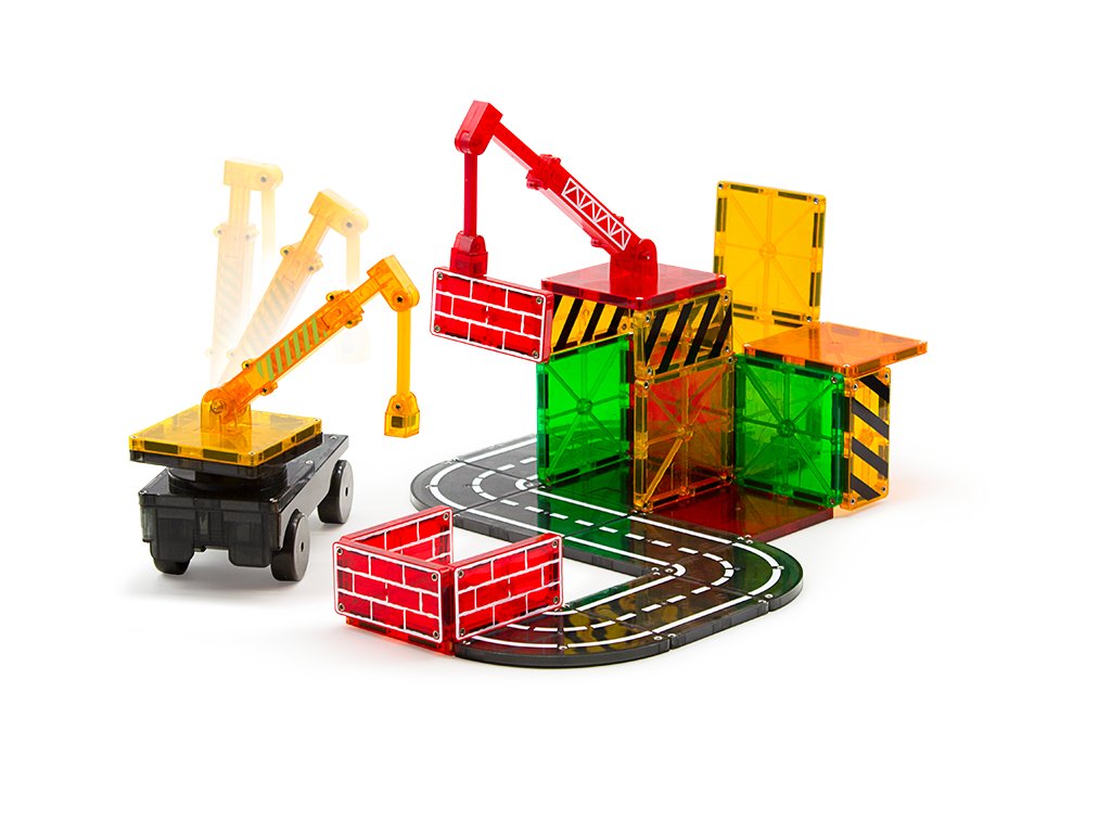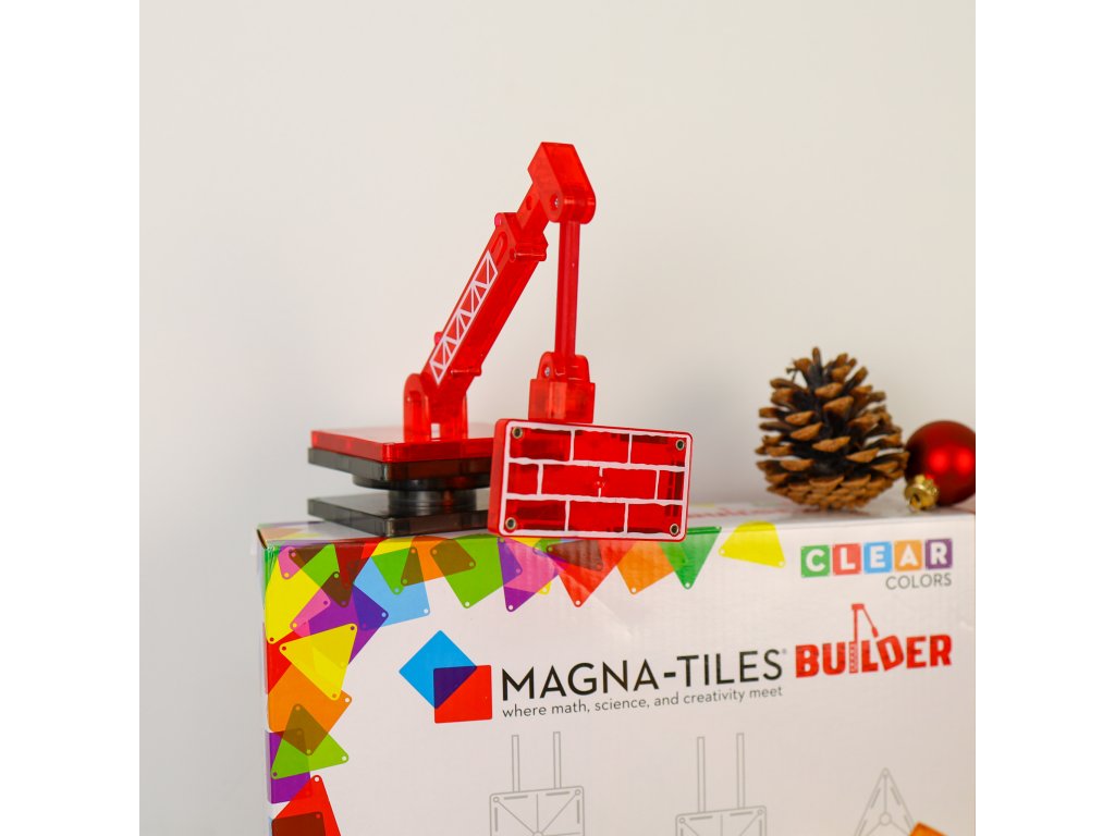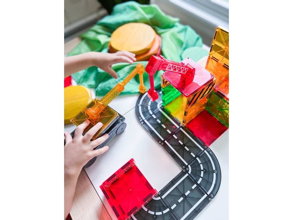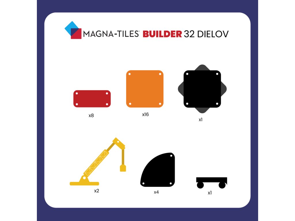 Magnetická stavebnica Builder 32 dielov Vytvorte jedinečné stavby s magnetickými žeriavmi Úžasná magnetická stavebnica MAGNA-TILES® Builder prináša hodiny nápaditej a sústredenej detskej zábavy. Deti sa môžu hrať samé alebo s kamarátmi, či rodičmi. Táto sada obsahuje príslušenstvo k vybudovaniu ciest a stroje, ktoré sa bežne nachádzajú na stavenisku. Dva výsuvné magnetické žeriavy, podvozok s kolieskami či dlaždice v podobe cesty podnecujú predstavivosť a zlepšujú obratnosť. Vymýšľajte stále nové varianty a rozmanité stavby. Táto súprava je kompatibilná so všetkými súpravami MAGNA-TILES®.Zmysluplná stavebnica pre malých staviteľov MAGNA-TILES je zástancom zmysluplnej hry, to znamená zábavnej a pútavej, no zároveň založenej na rozvíjaní detských zručností. Táto stavebnica podporuje rozvoj koordinácie ruka-oko, jemnej motoriky a logického myslenia prostredníctvom skúmania príčiny a následku. Bezpečnosť a špičková kvalita sú zaistené použitím potravinárskeho, netoxického plastu MABS bez BPA, ftalátov a latexu. Pevná konštrukcia dielikov zabraňuje praskaniu a udržiava magnety bezpečne na svojom mieste.Sada obsahuje 32 magnetických dielikov:10x štvorec,6x štvorec - cesta,4x štvrťkruh - cestná zákruta,8x, obdĺžnik (4 tehla a 4 upozornenie),1x spinner,1x kolesový podvozok,2x výsuvný žeriav.Dodatočné parametre