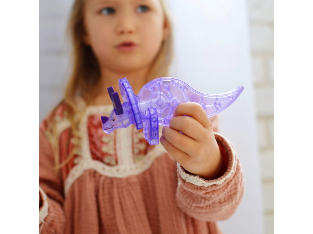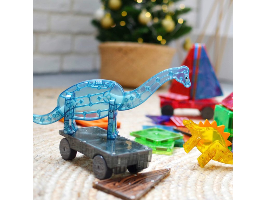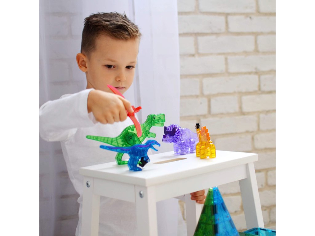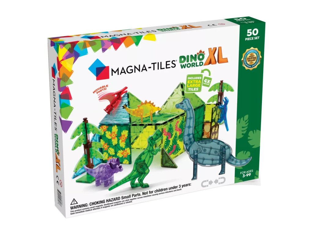 Magnetická stavebnica Dino Svet XL 50 dielov Poskladajte si úžasný dinosaurí svet Magnetická sada XL Dino World v sebe ukrýva najväčšiu stavebnicu všetkých čias. Obsahuje šesť magnetických figúrok dinosaurov, ktoré sa líšia veľkosťou a všetky majú pohyblivé časti pre ešte zábavnejšiu imaginárnu hru. V spojení s magnetickými stromami a listami si vybudujete dokonalý tropický raj. Deti okrem jemnej motoriky a logiky zároveň rozvýjajú záujem o paleonotológiu. Stavebnica je kompatibilná so všetkými súpravami MAGNA-TILES®.Zmysluplná stavebnica pre malých staviteľov MAGNA-TILES je zástancom zmysluplnej hry, to znamená zábavnej a pútavej, no zároveň založenej na rozvíjaní detských zručností. Táto stavebnica podporuje rozvoj koordinácie ruka-oko, jemnej motoriky a logického myslenia prostredníctvom skúmania príčiny a následku. Bezpečnosť a špičková kvalita sú zaistené použitím potravinárskeho, netoxického plastu MABS bez BPA, ftalátov a latexu. Pevná konštrukcia dielikov zabraňuje praskaniu a udržiava magnety bezpečne na svojom mieste.Sada obsahuje 50 magnetických dielikov:6x figúrka dinosaurov - Pteranodon (červený), T-Rex (zelený), Stegosaurus (žltý) a Velociraptor (modrý), Triceratops (fialový) a Brachiosaurus (bridlicovo modrý),6x veľký štvorec,6x veľký pravý trojuholník,4x, veľký rovnostranný trojuholník,8x štvorec,2x pravý trojuholník,16x list stromov,2x stromová základňa.Dodatočné parametre