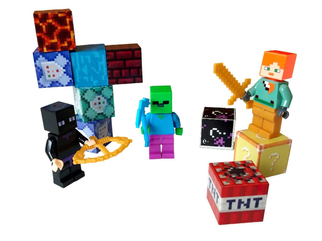 Figúrky verne napodobňujú známe postavy z hry Minecraft – od hráčov, zombíkov, kostlivcov až po endermana či creepera. Nechýbajú ani tematické bloky ako TNT, tráva, drevo alebo láva, ktoré rozširujú možnosti kreatívnej hry.