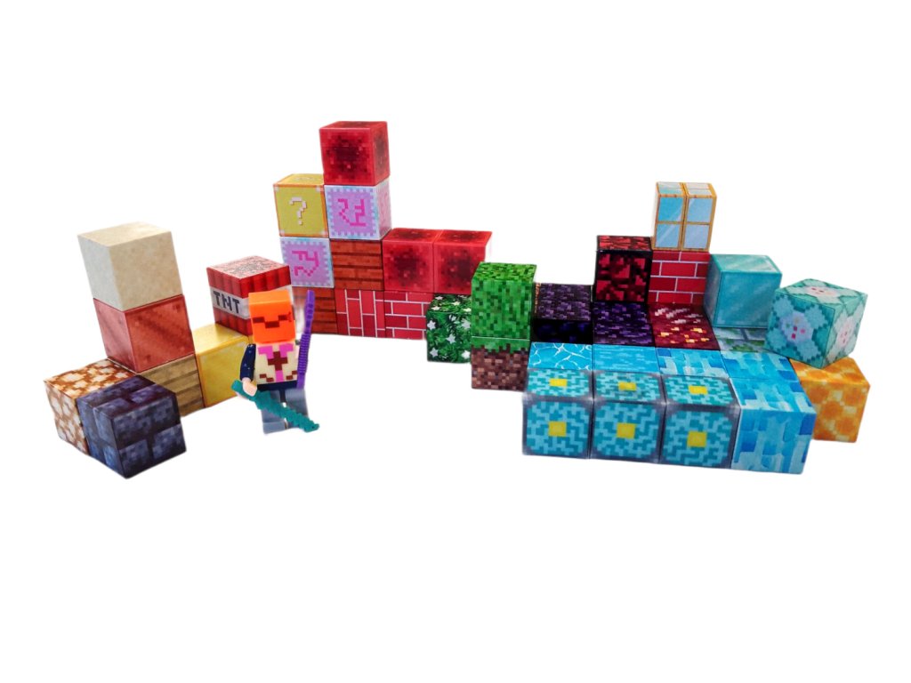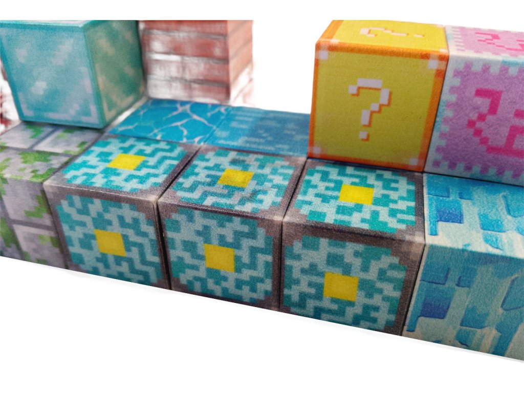 Kocky sú vyrobené z plastu a obsahujú bezpečné magnety, ktoré zabezpečujú jednoduché a stabilné spájanie. Povrchy zdobia realistické textúry herných materiálov – napríklad TNT, tráva, diamantový blok, tehly, voda alebo zlato. Deti si tak môžu vytvárať vlastné svety, stavby a scény podľa svojej fantázie. Súčasťou sady je aj akčná figúrka pripomínajúca postavu z hry, vybavená mečom a sekerou. Vďaka tomu môžu deti rozvíjať nielen stavebné, ale aj herné scenáre a ponoriť sa do tvorivého hrania plného napätia a fantázie.