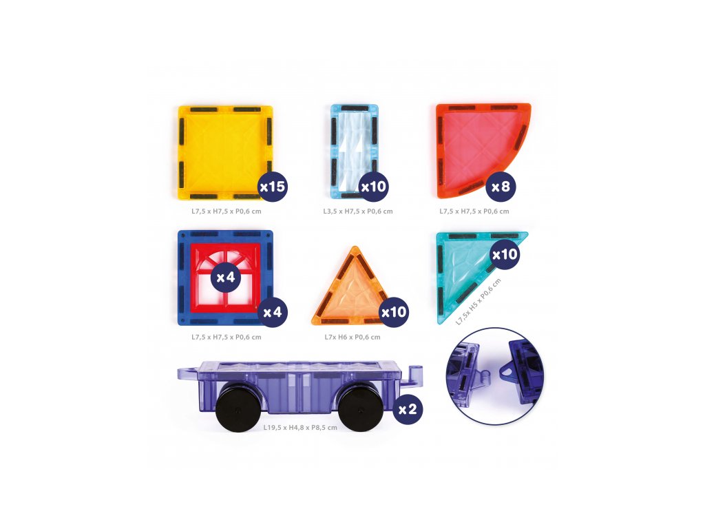 Objavte svet plný pohybu a fantázie s magnetickou stavebnicou Ludi! Praktický plastový box s držadlom ukrýva 63 magnetických dielikov, medzi ktorými sú aj 2 podvozky s kolieskami, vďaka ktorým môžu deti stavať vlastné autá, nákladiaky alebo napríklad pohyblivé stavebné stroje.Deti môžu kombinovať rôzne časti a vytvárať nekonečné množstvo vozidiel a stavebných štruktúr.