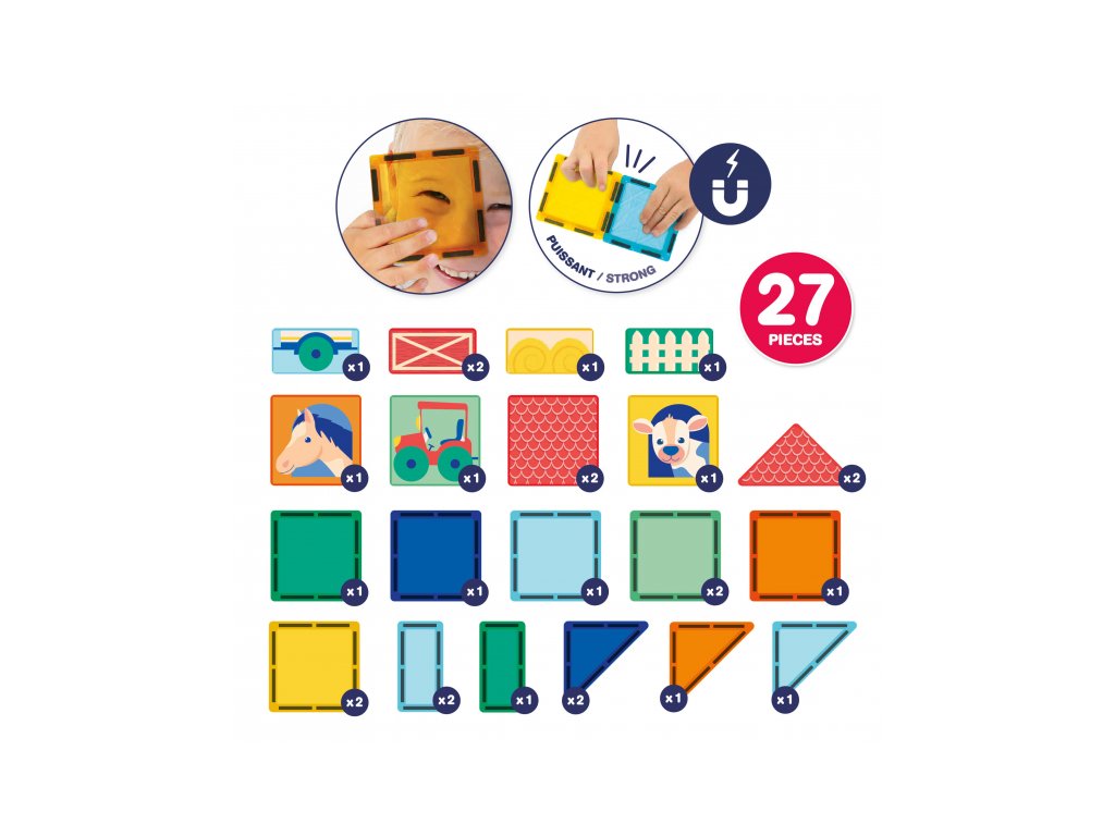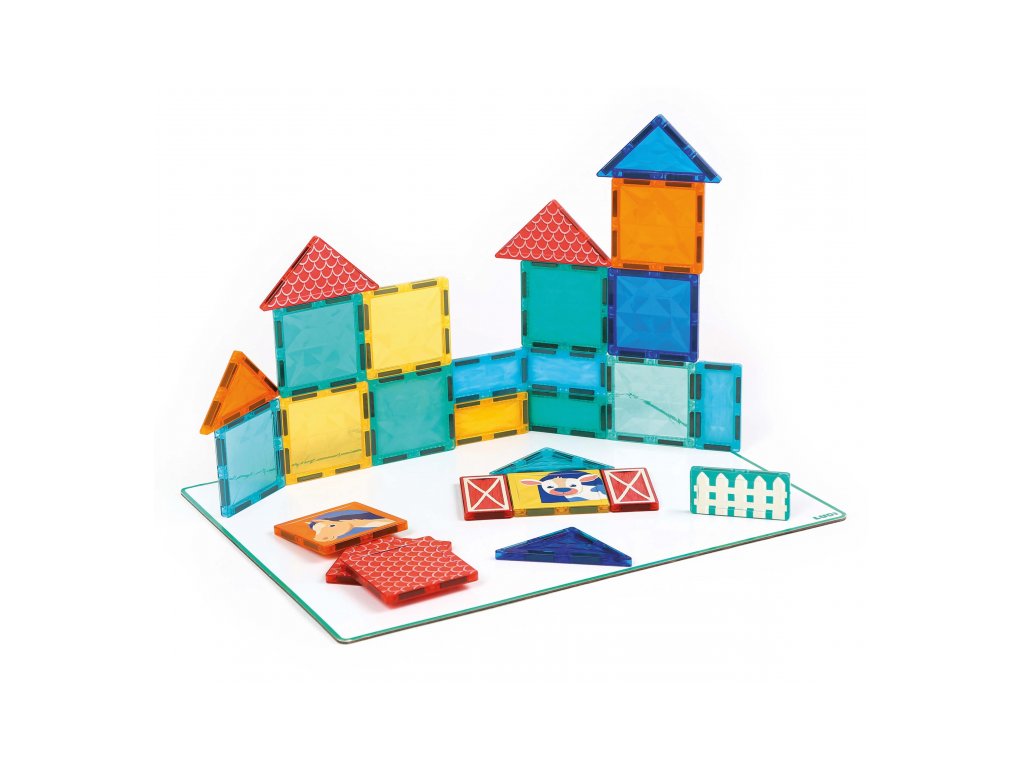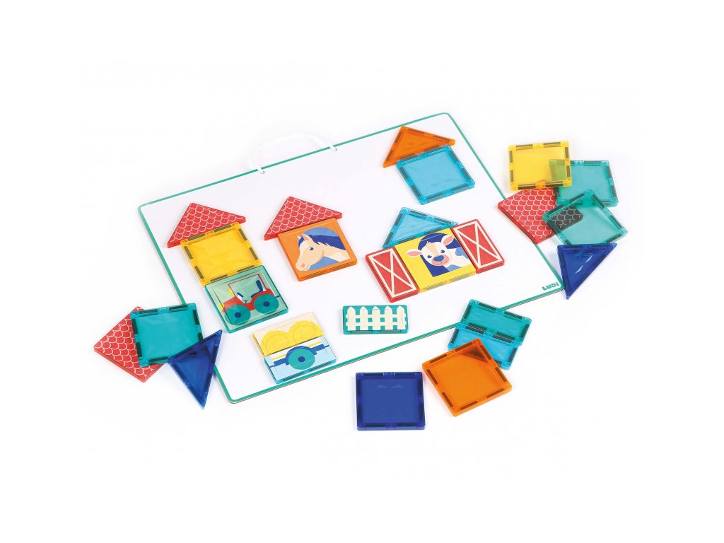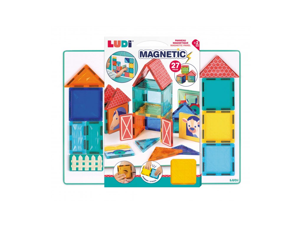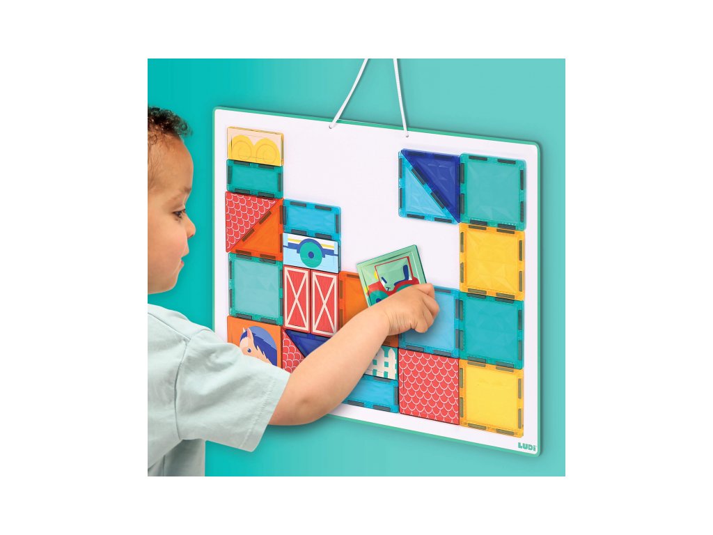 Rozviňte detskú kreativitu, predstavivosť a logické myslenie s touto originálnou magnetickou stavebnicou Ludi s tabuľou a motívmi zo života na farme. Farebná sada s 27 priehľadnými aj ilustrovanými dielikmi ponúka zábavné stavanie v 2D aj 3D. Deti môžu vytvárať scény zo života na farme – postaviť si stajne, polia, výbehy pre zvieratká alebo sa hrať s traktorom a domácimi zvieratami. Priehľadné farebné dieliky vytvárajú pri dopade svetla nádherné tiene a svetelné efekty – ako v kaleidoskope. Nechýbajú ani ilustrované dieliky s motívmi koníka, kravy, ohrady alebo traktora.