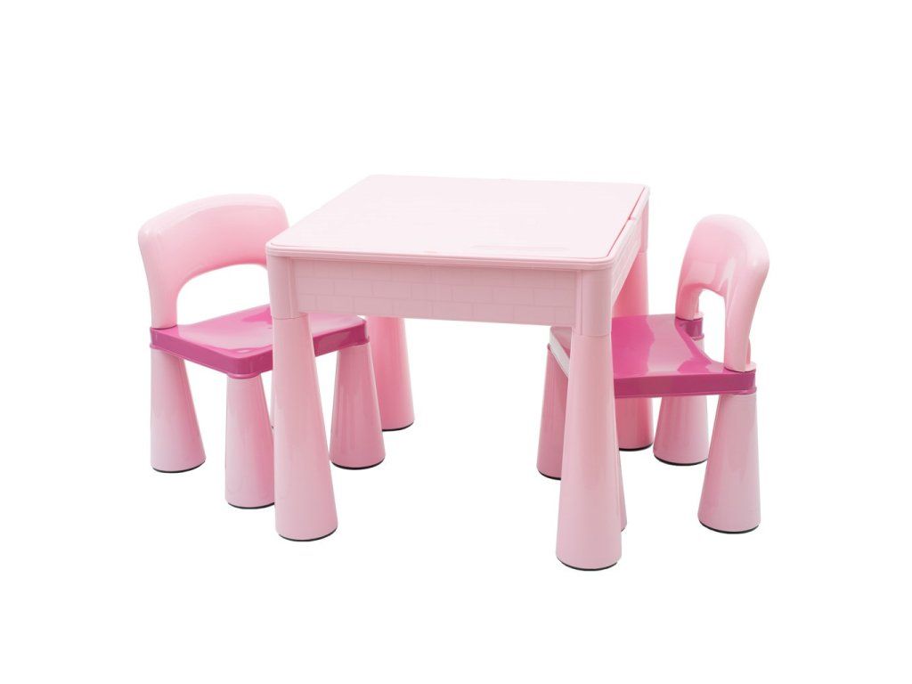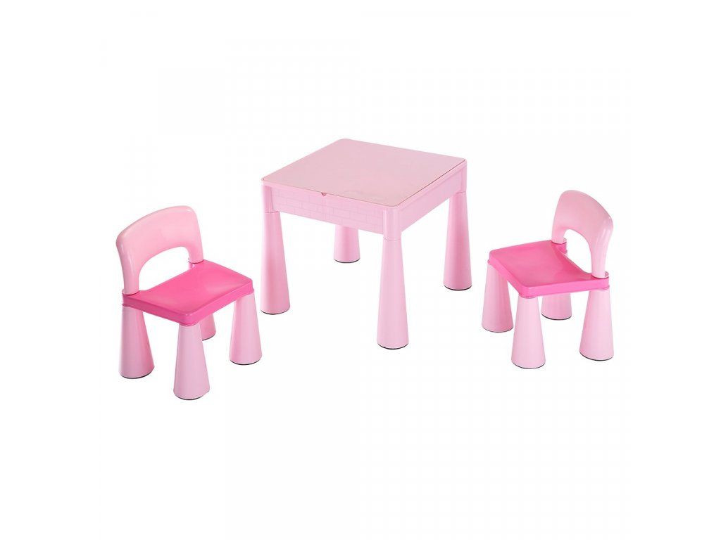 Detská sada New Baby obsahuje stôl a 2 stoličky. Stolček je veľmi praktický. Otočením hornej dosky sa stane základom pre stavanie kociek stavebnice Lego Klasik i Lego Duplo. Pod hornou doskou je priestor pre uskladnenie hračiek, kresliacich potrieb, apod. Do priestoru možno po odstránení hornej dosky tiež naliať trošku vody a dieťa si naplno užije svoje obľúbené vodné radovánky, alebo možno v tomto priestore vytvoriť mini pieskovisko. Rozmery: stôl 51x51x46cm, stolička 36x32x46cm (š, d, v). Výška sedátka 25cm.