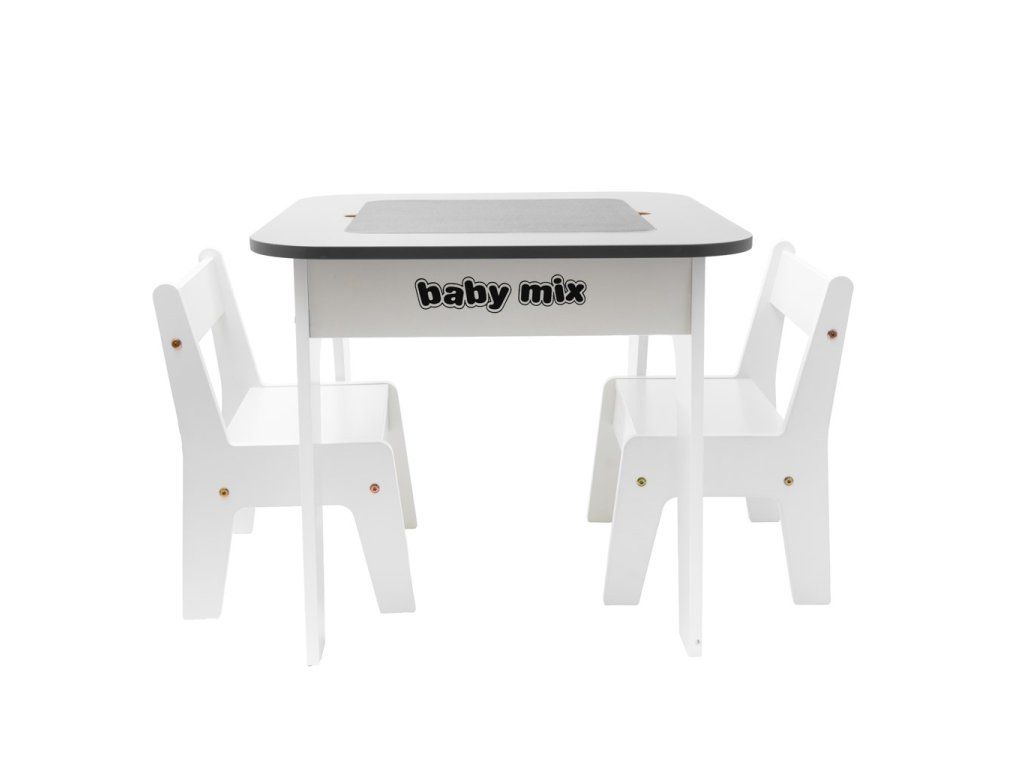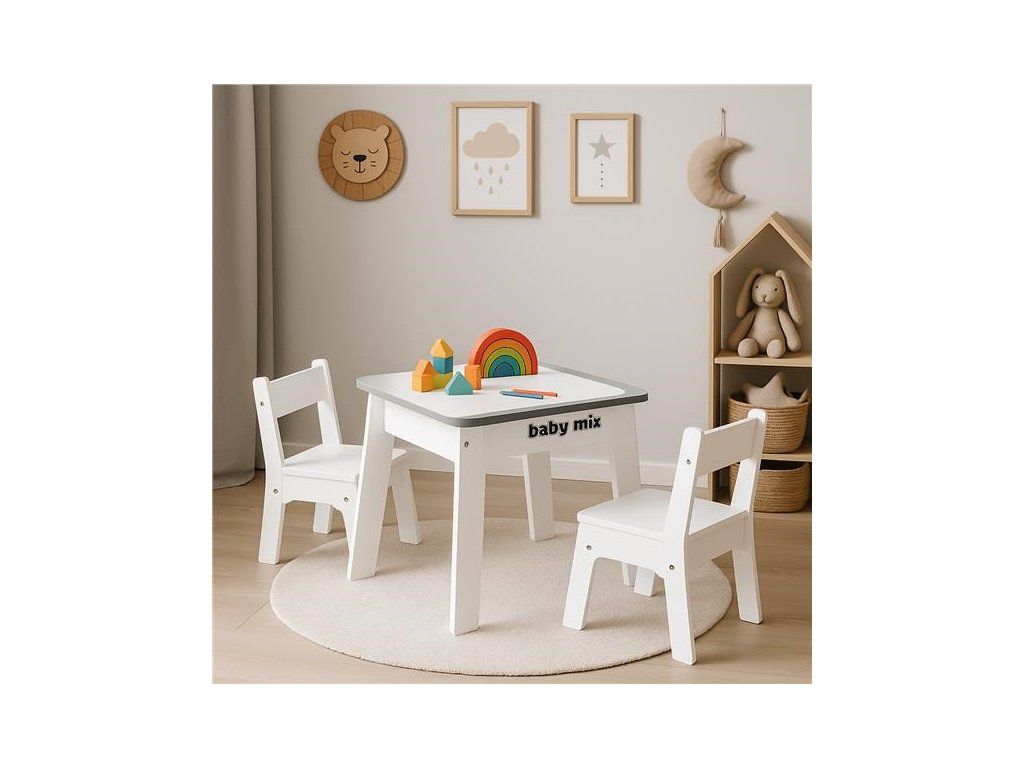 Súčasťou setu je stôl a dve stoličky vyrobené z odolného materiálu, ktorý zabezpečuje stabilitu a dlhú životnosť. Stôl je vybavený praktickou odnímateľnou doskou – pod ňou sa nachádza úložný priestor, kam možno jednoducho uložiť pastelky, papier, drobné hračky alebo stavebnice. Deti tak majú všetko potrebné vždy po ruke a zároveň si udržiavajú poriadok.
