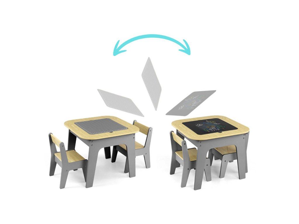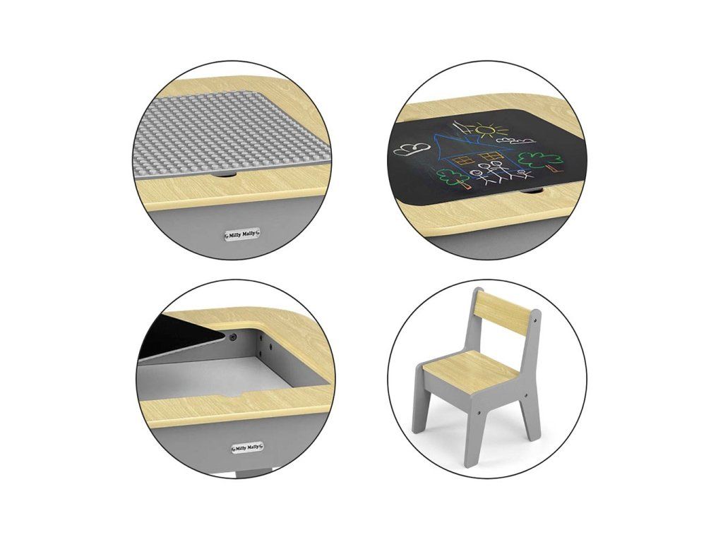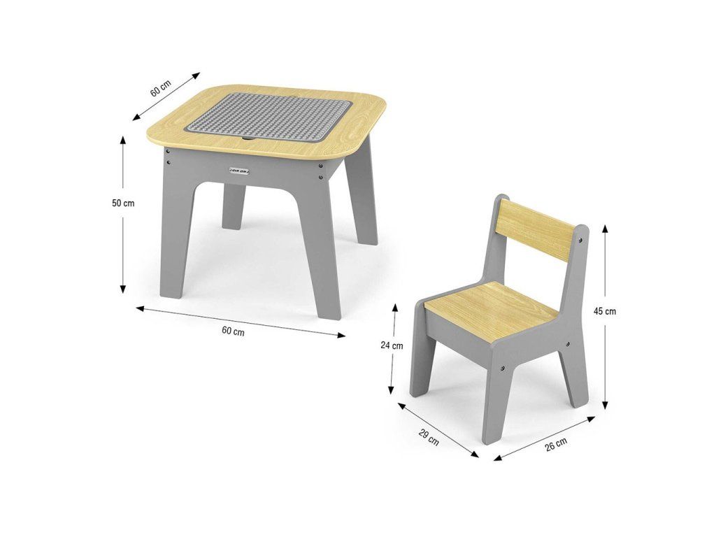 Set Olaf Blocks sa vyznačuje jedinečnou doskou stola – jedna strana je prispôsobená pre stavebné kocky, vďaka čomu je stolík ideálnym základom na stavanie. Druhá strana je hladká a ideálna na kreslenie, písanie alebo iné tvorivé aktivity. Doska je odnímateľná a pod ňou sa nachádza priestranný úložný priestor, ktorý uľahčuje uskladnenie hračiek, kociek alebo výtvarných potrieb, čo pomáha udržiavať poriadok.