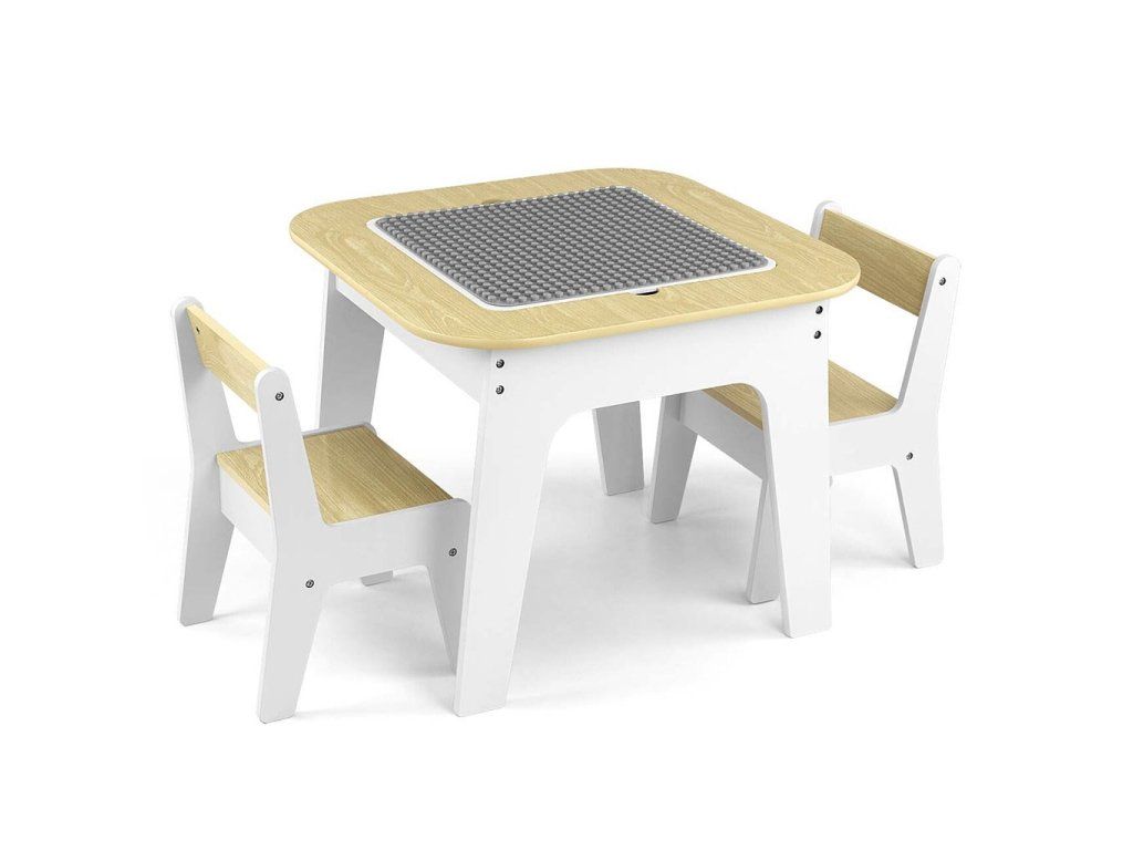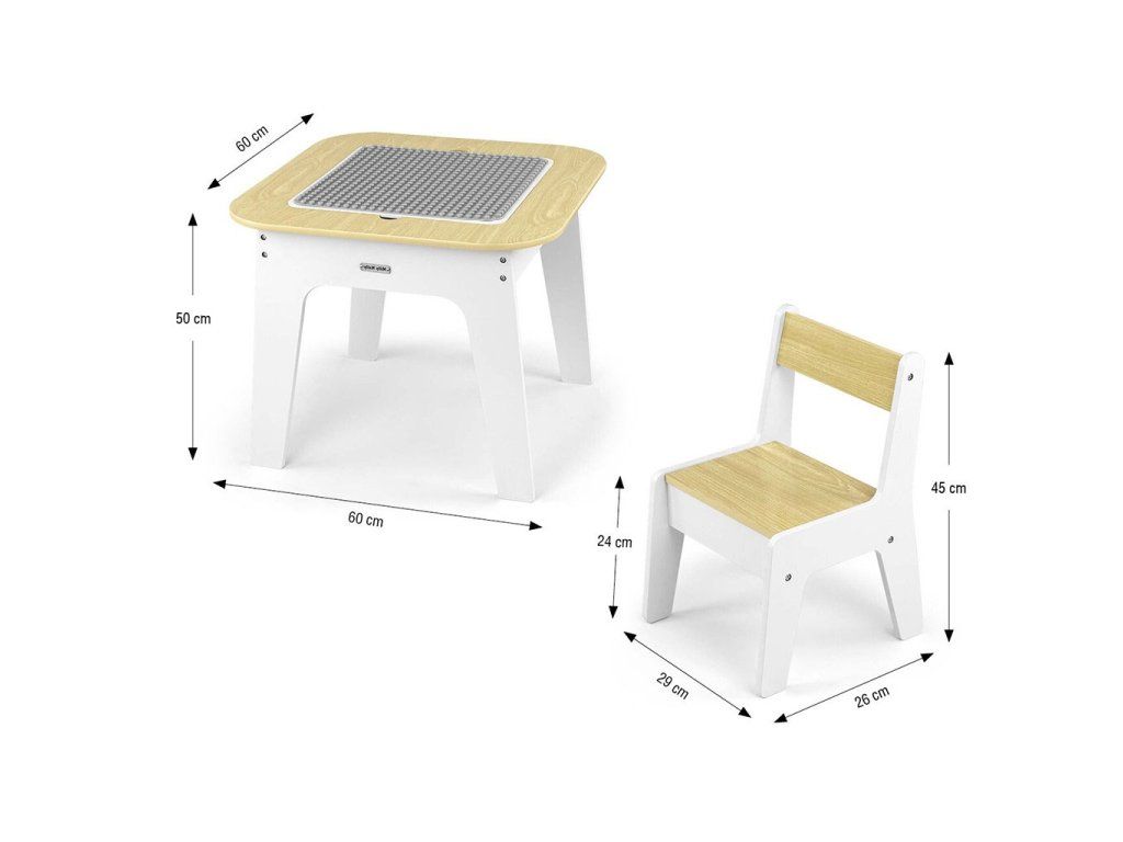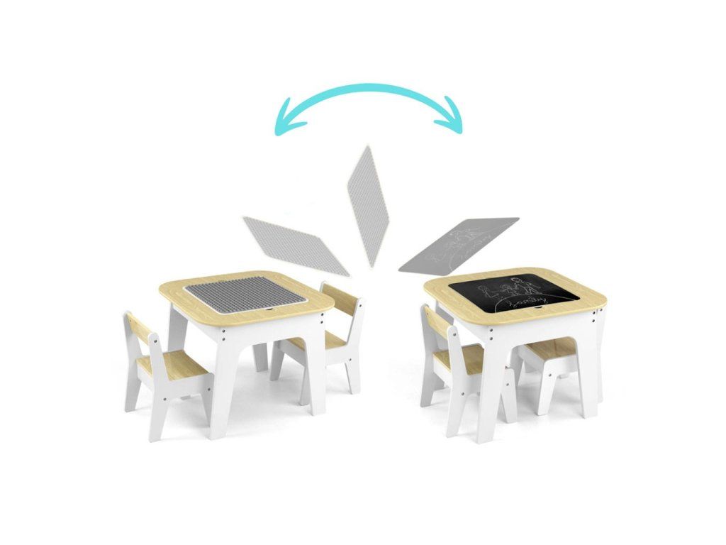 Set Olaf Blocks sa vyznačuje jedinečnou doskou stola – jedna strana je prispôsobená pre stavebné kocky, vďaka čomu je stolík ideálnym základom na stavanie. Druhá strana je hladká a ideálna na kreslenie, písanie alebo iné tvorivé aktivity. Doska je odnímateľná a pod ňou sa nachádza priestranný úložný priestor, ktorý uľahčuje uskladnenie hračiek, kociek alebo výtvarných potrieb, čo pomáha udržiavať poriadok.