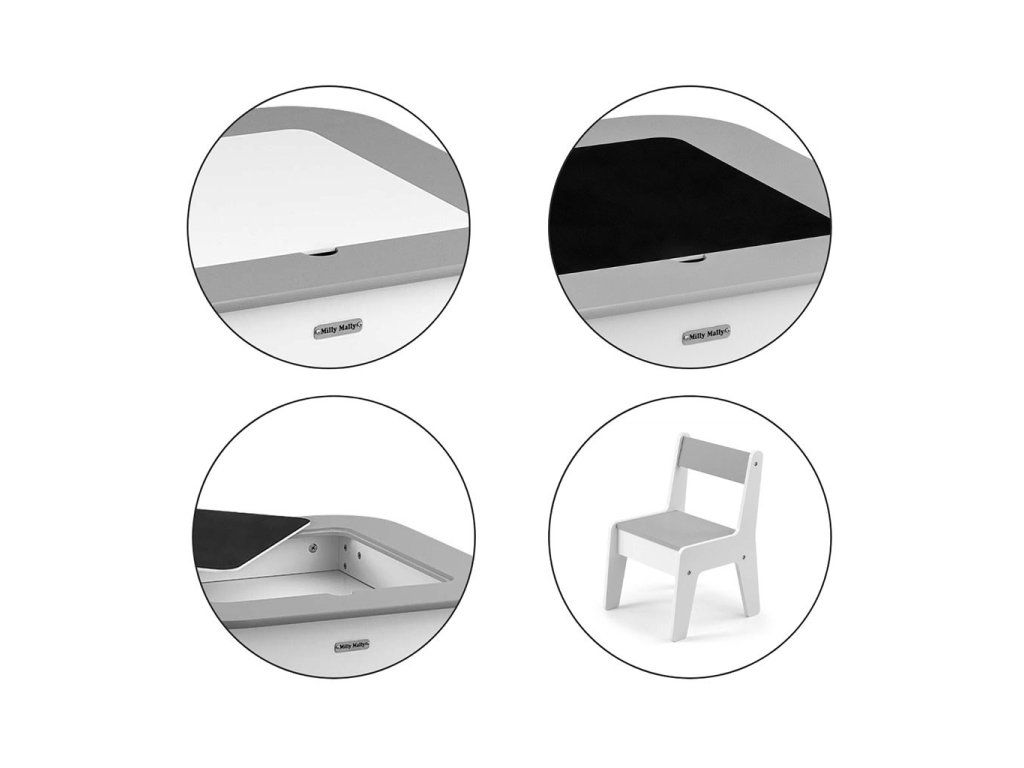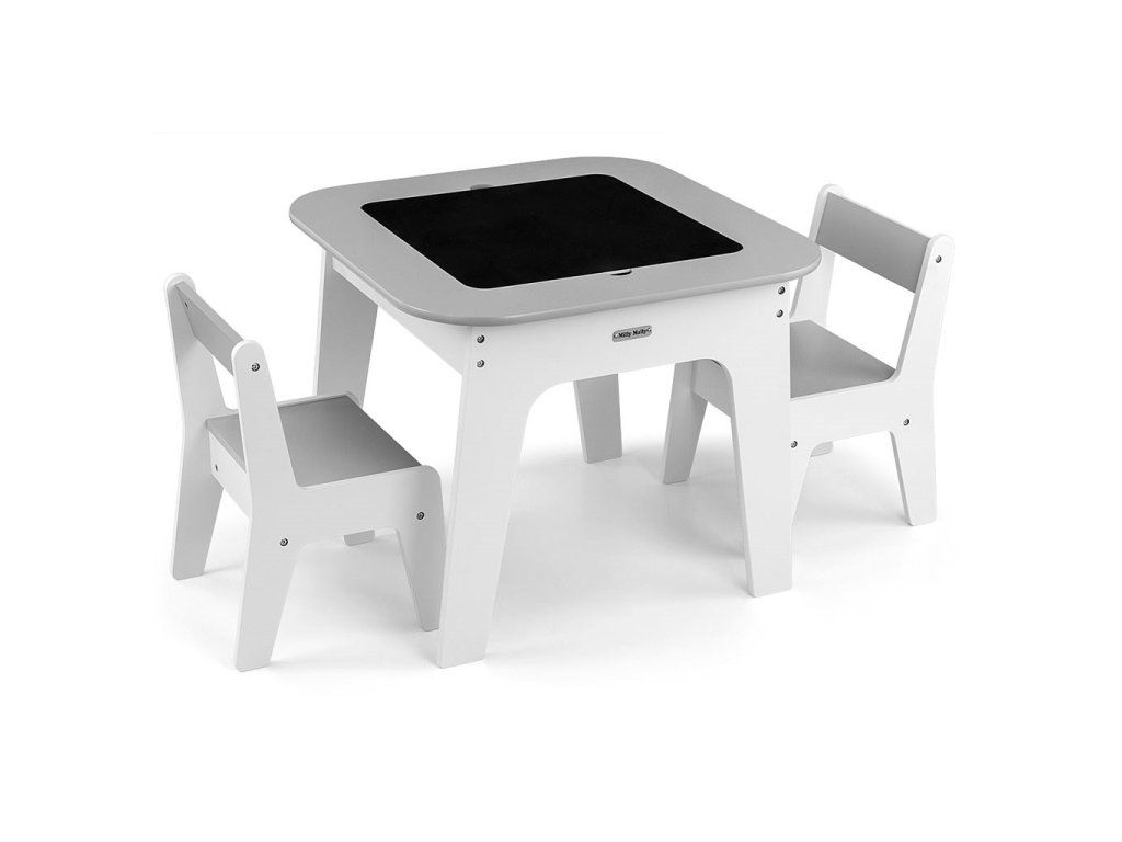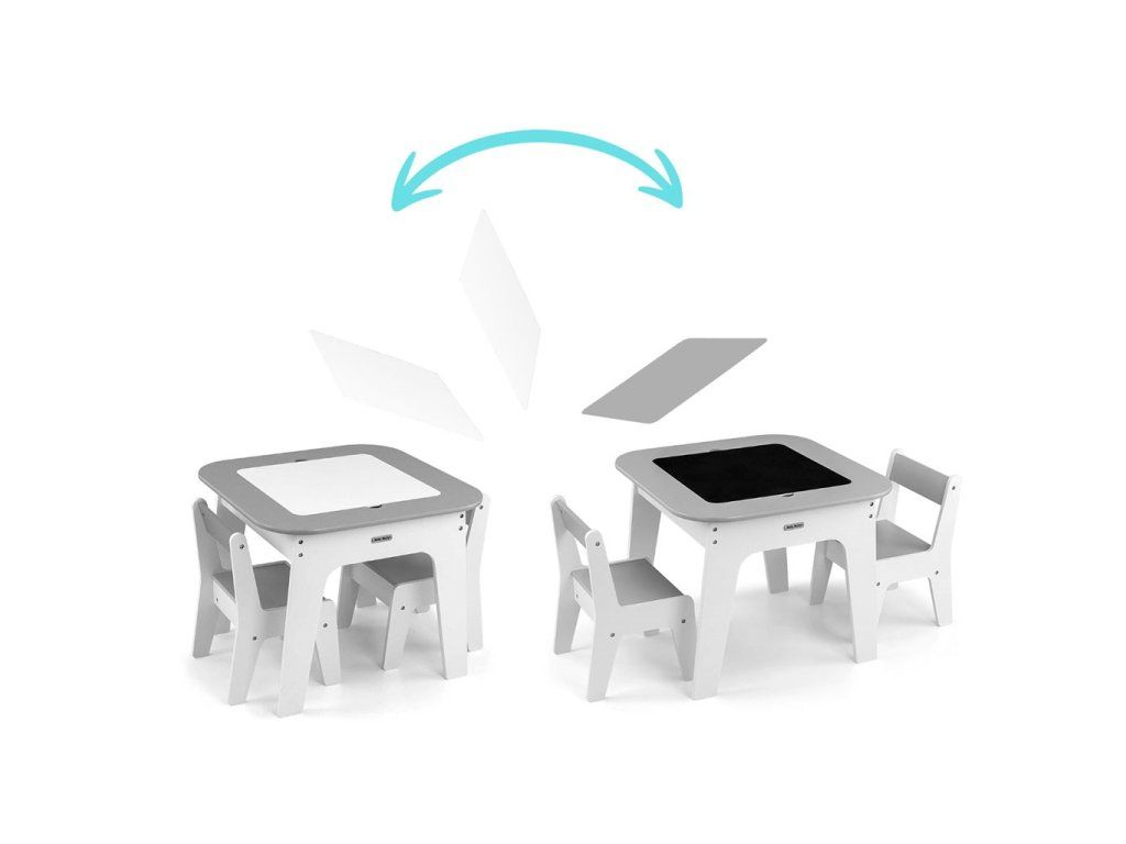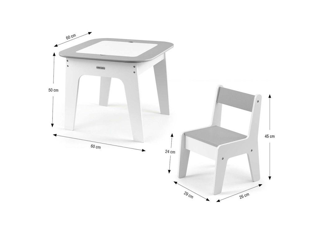 Set Olaf sa vyznačuje jedinečnou doskou – jedna strana vnútornej dosky je biela, zatiaľ čo druhá strana je hladká a natretá tabuľovou farbou, ideálna na kreslenie, písanie alebo iné výtvarné aktivity. Doska je vyberateľná a pod ňou sa nachádza priestranný úložný priestor, ktorý uľahčuje skladovanie hračiek, kociek alebo výtvarných potrieb, čo zjednodušuje udržiavanie poriadku.