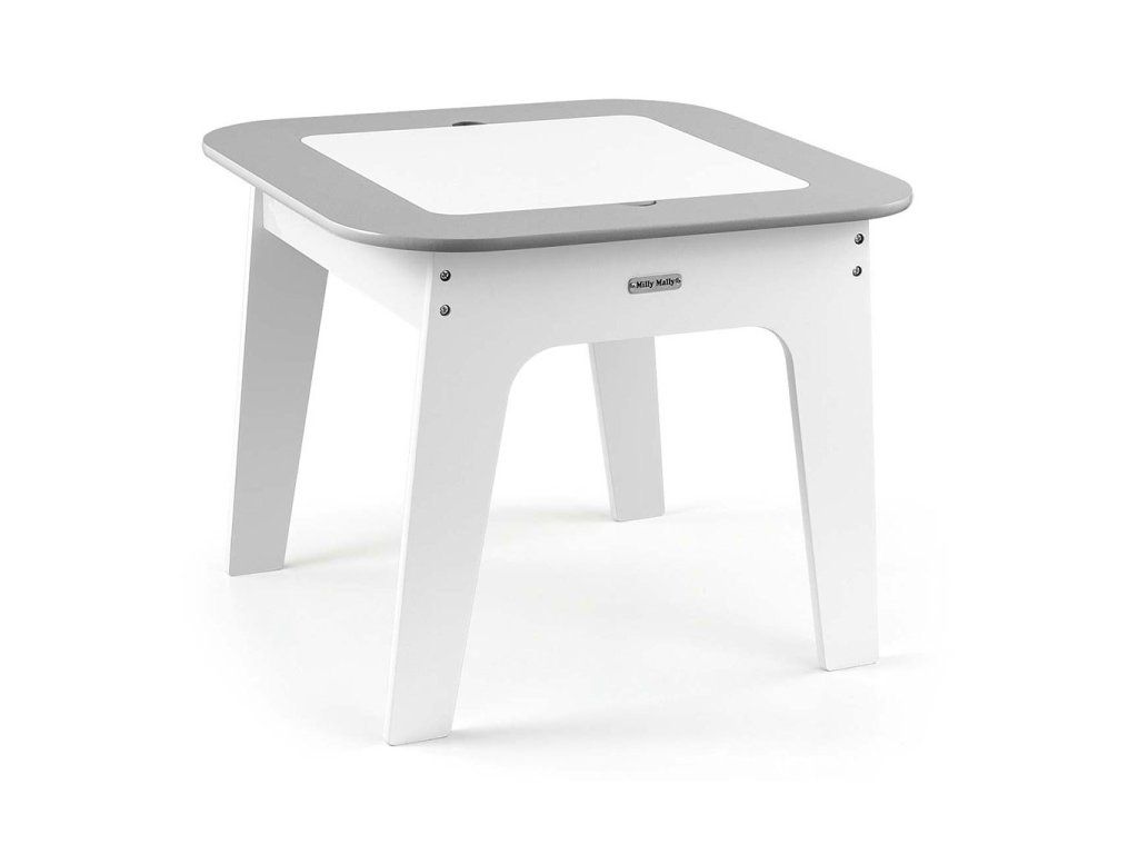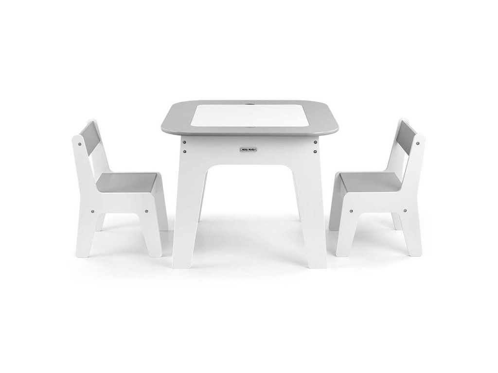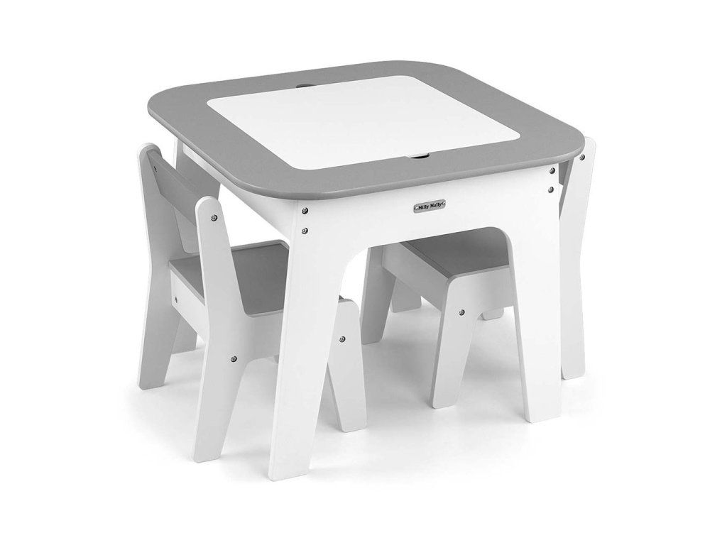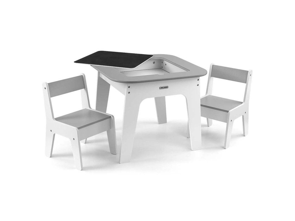 Set Olaf sa vyznačuje jedinečnou doskou – jedna strana vnútornej dosky je biela, zatiaľ čo druhá strana je hladká a natretá tabuľovou farbou, ideálna na kreslenie, písanie alebo iné výtvarné aktivity. Doska je vyberateľná a pod ňou sa nachádza priestranný úložný priestor, ktorý uľahčuje skladovanie hračiek, kociek alebo výtvarných potrieb, čo zjednodušuje udržiavanie poriadku.