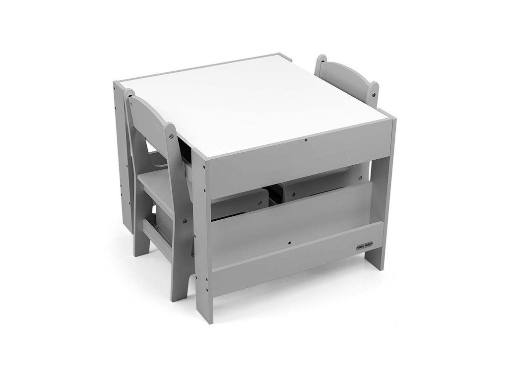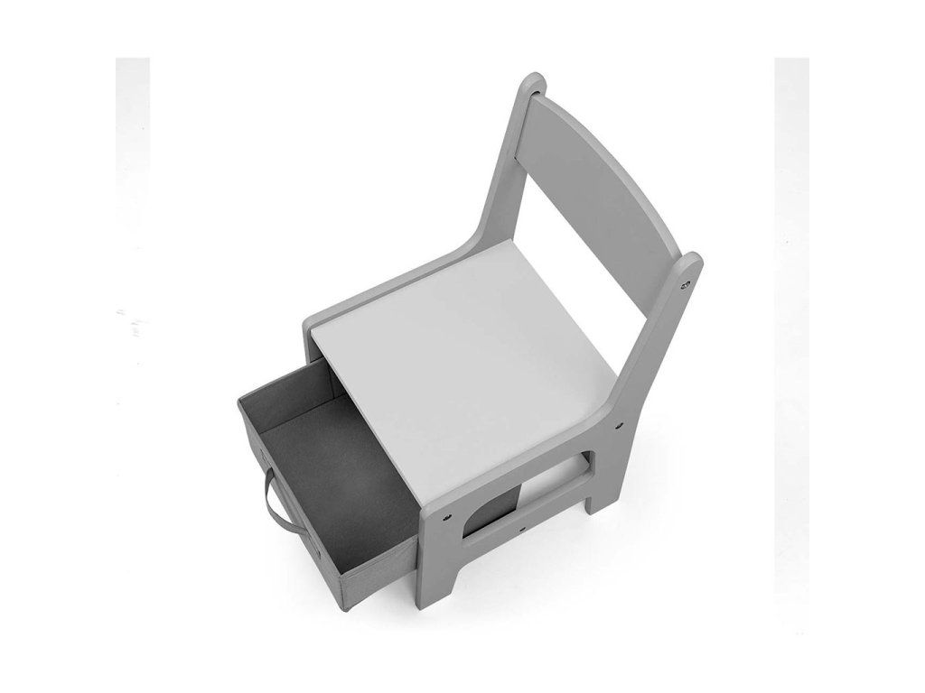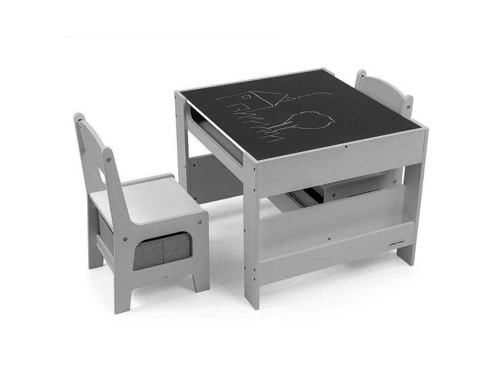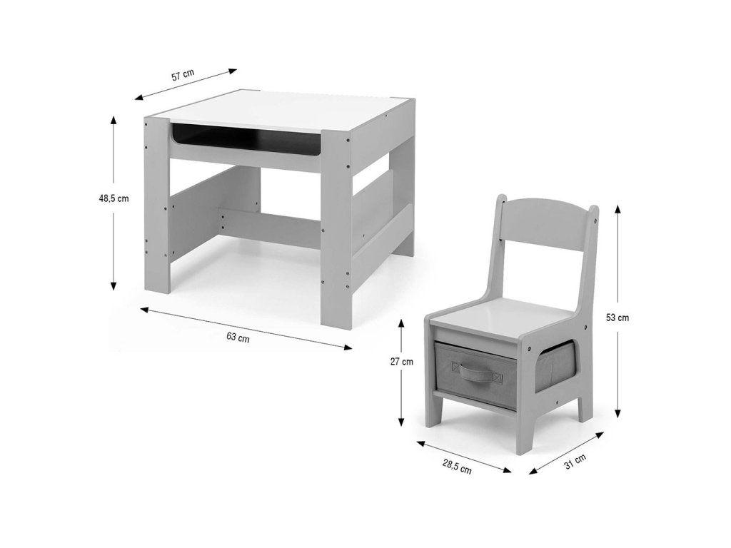 Súprava multifunkčného nábytku pre deti. Stôl SVEN s 2 stoličkami v bielej a sivej farbe so sivými doplnkami je vyrobený tak, aby deťom poskytoval: pohodlie, priestor na tvorivú hru, maľovanie, písanie a maximálne pohodlie počas aktivít. Súprava obsahuje 2 stoličky s 2 textilnými úložnými pomôckami zasunutými do poličky pod stoličkami. Stôl je vybavený obrovským úložným priestorom umiestneným pod obojstrannou odnímateľnou doskou. Má aj bočné úložné poličky. Na jednej strane stolovej dosky sa nachádza veľká kresliaca doska. Stoličky sú ľahké a deti s nimi môžu voľne pohybovať. Nábytok je vyrobený s výnimočnou precíznosťou a starostlivosťou. Obe stoličky majú zaoblené rohy, ktoré chránia dieťa pred zranením. Všetky prvky konštrukcie stola a stoličiek zabezpečujú vysokú stabilitu a minimalizujú riziko pádu. Súprava Sven je vyrobená z MDF je odolná a ľahko sa udržiava. Súprava nábytku sa ľahko zostavuje a všetky komponenty potrebné na montáž sú súčasťou balenia.