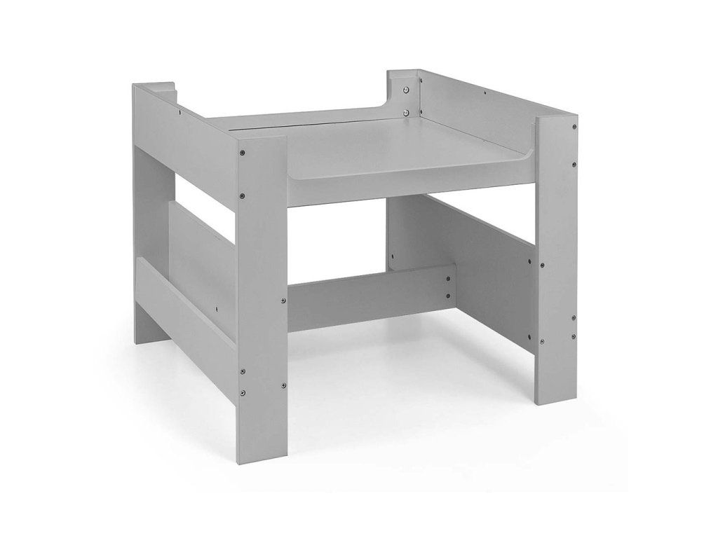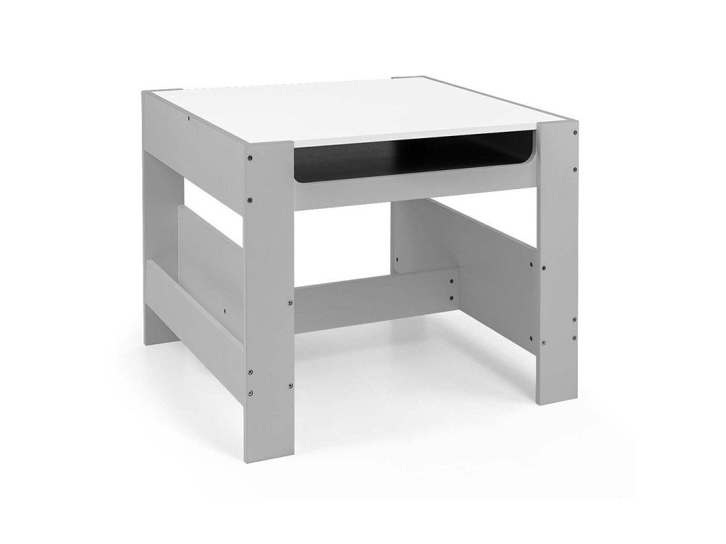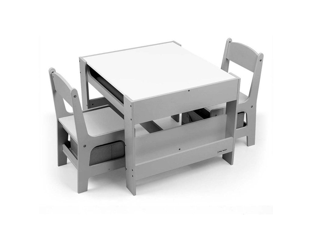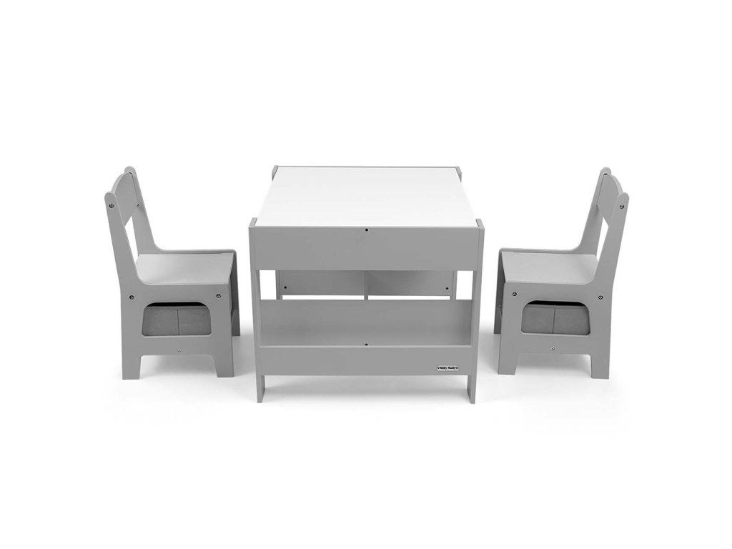 Súprava multifunkčného nábytku pre deti. Stôl SVEN s 2 stoličkami v bielej a sivej farbe so sivými doplnkami je vyrobený tak, aby deťom poskytoval: pohodlie, priestor na tvorivú hru, maľovanie, písanie a maximálne pohodlie počas aktivít. Súprava obsahuje 2 stoličky s 2 textilnými úložnými pomôckami zasunutými do poličky pod stoličkami. Stôl je vybavený obrovským úložným priestorom umiestneným pod obojstrannou odnímateľnou doskou. Má aj bočné úložné poličky. Na jednej strane stolovej dosky sa nachádza veľká kresliaca doska. Stoličky sú ľahké a deti s nimi môžu voľne pohybovať. Nábytok je vyrobený s výnimočnou precíznosťou a starostlivosťou. Obe stoličky majú zaoblené rohy, ktoré chránia dieťa pred zranením. Všetky prvky konštrukcie stola a stoličiek zabezpečujú vysokú stabilitu a minimalizujú riziko pádu. Súprava Sven je vyrobená z MDF je odolná a ľahko sa udržiava. Súprava nábytku sa ľahko zostavuje a všetky komponenty potrebné na montáž sú súčasťou balenia.