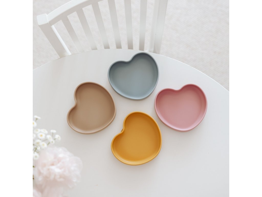 Silikónový tanier s prísavkou SRDCE ponúkame v 4 farebných prevedeniach: béžová, modrá, ružová a žltá.