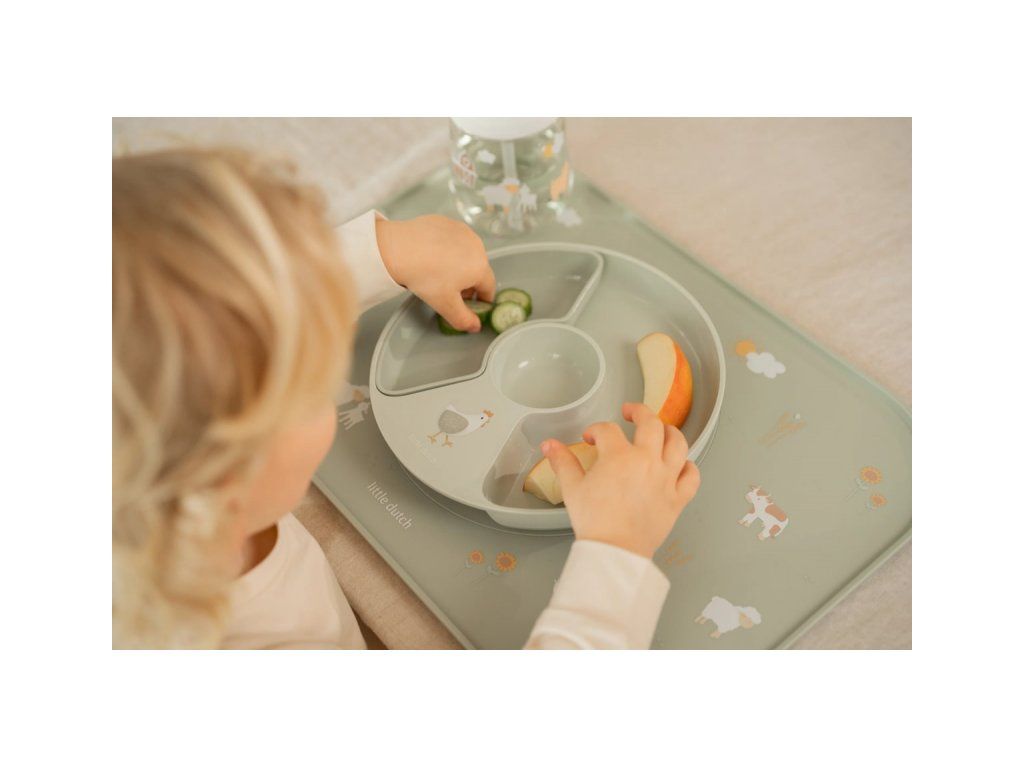 Detský tanier s krásnou potlačou má protišmykové dno a vysoký okraj, ktorý pomáha dieťaťu jedlo nabrať na lyžicu. Tanier je tak ideálny na prvé samostatné stolovanie dieťaťa. Vyberateľná priehradka umožňuje rozdelenie jednotlivých častí jedla do 2, 3 alebo 4 priehradok. Vďaka praktickému úchytu sa tanier ľahko prenáša. Je vyrobený z ľahkého, mimoriadne odolného plastu.