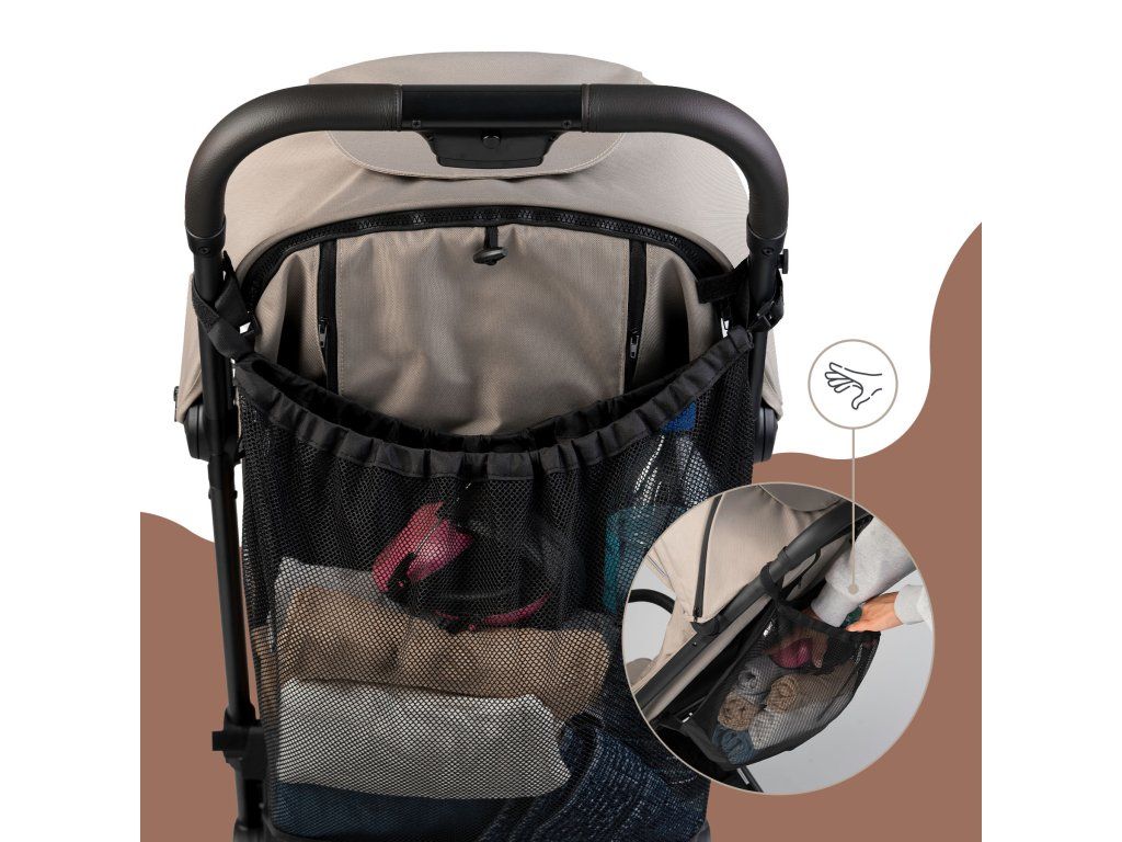 Sieťová taška je vybavená nastaviteľným systémom suchých zipsov pre rýchle a jednoduché pripevnenie k väčšine modelov kočíkov. Vysoko kvalitný materiál zaisťuje odolnosť proti každodennému používaniu, zatiaľ čo sieťovina umožňuje rýchly prehľad o obsahu. Horné zapínanie chráni predmety pred vypadnutím počas jazdy.