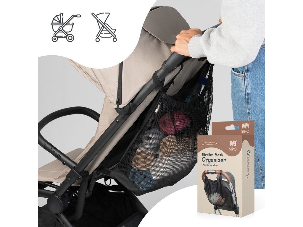 Sieťový organizér SIPO je určený na ukladanie a usporiadanie potrebných vecí počas prechádzok s dieťaťom. Je určený na použitie so športovými kočíkmi a detskými golfovými kočíkmi. Ideálny na krátke prechádzky, každodenné výlety a cestovanie s dieťaťom.