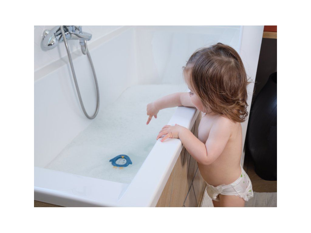 Teplomer na kontrolu teploty vody v detskom kúpeli pláva na hladine pre ľahké čítanie nameranej teploty.