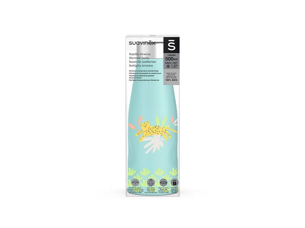 Termo nerezová fľaša na tekutiny JUNGLE značky Suavinex je ideálna pre uchovanie a prepravu teplých i chladných nápojov - uchováva teplotu tekutín po dobu až 4 hodín. Je veľkým pomocníkom pri výletoch s deťmi von alebo na prípravu mlieka vopred pre nočné kŕmenie.