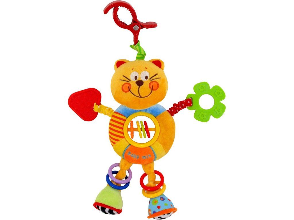 Plyšová hračka Baby Mix v tvare mačky. Mačka hrká, píska a má hryzátka. Hračka má klip pre zavesenie. Výška cca 23 cm. Hračka je vhodná pre deti od narodenia.