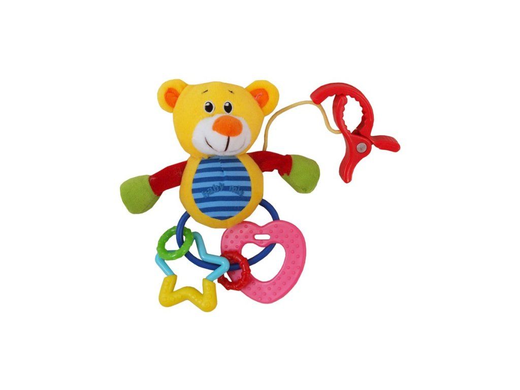 Farebná plyšová hrkajúca hračka medvedík Baby Mix pre bábätká. Vďaka klipu sa dá detská hračka pripevniť ku kočíku alebo postieľke. Výška cca 18 cm. Vhodné pre deti od prvých dní života