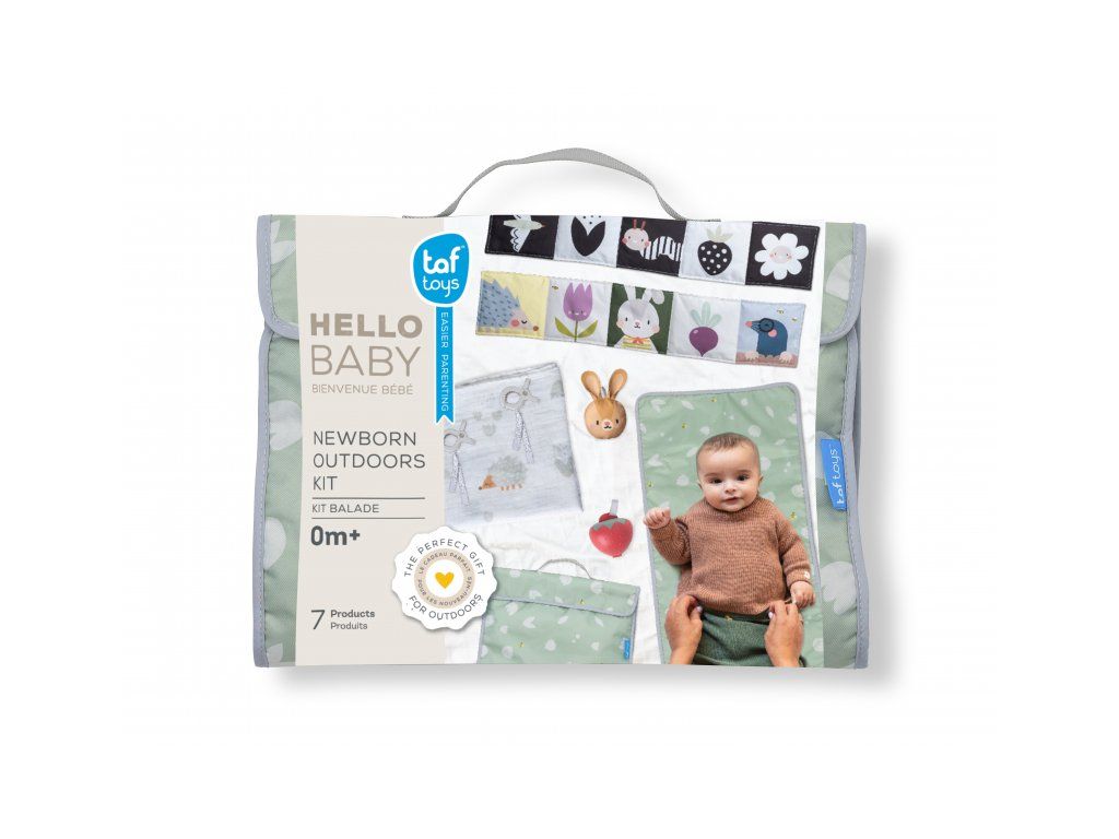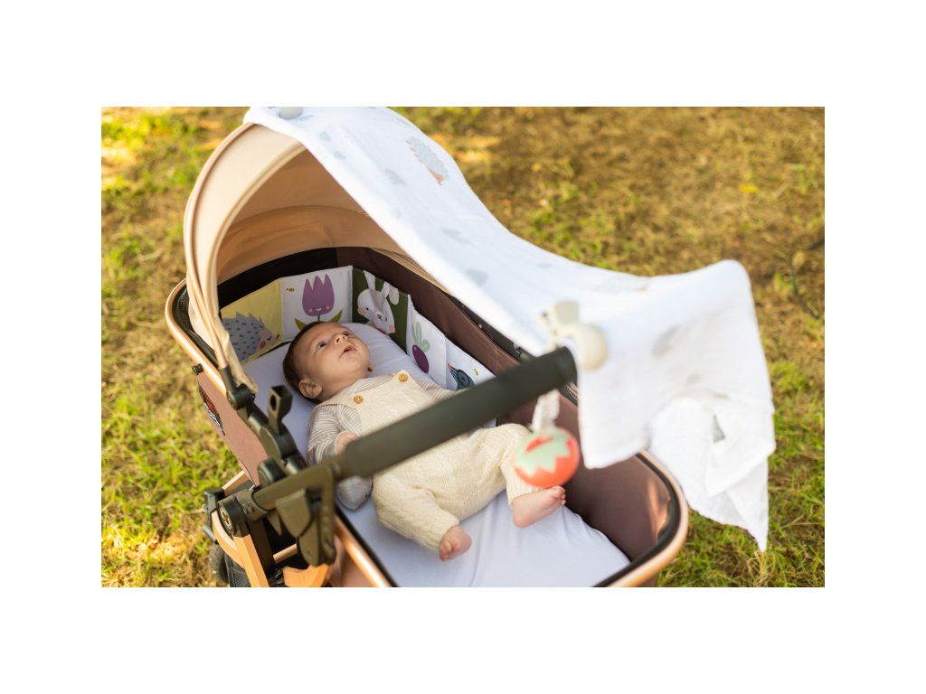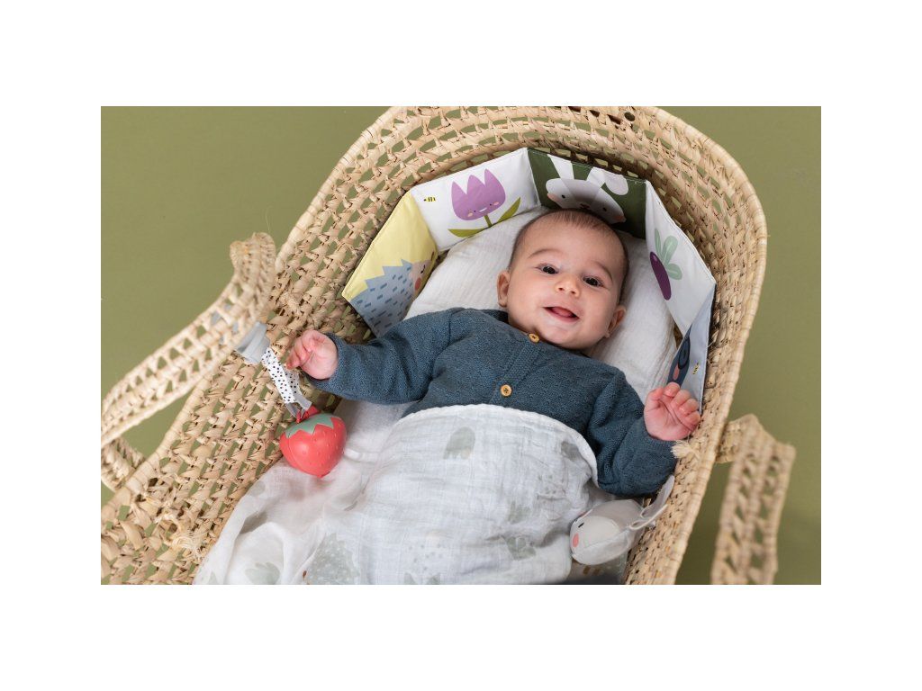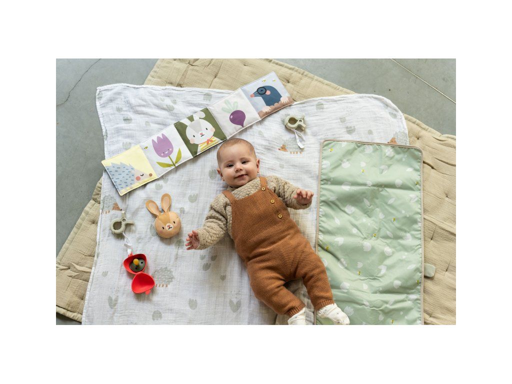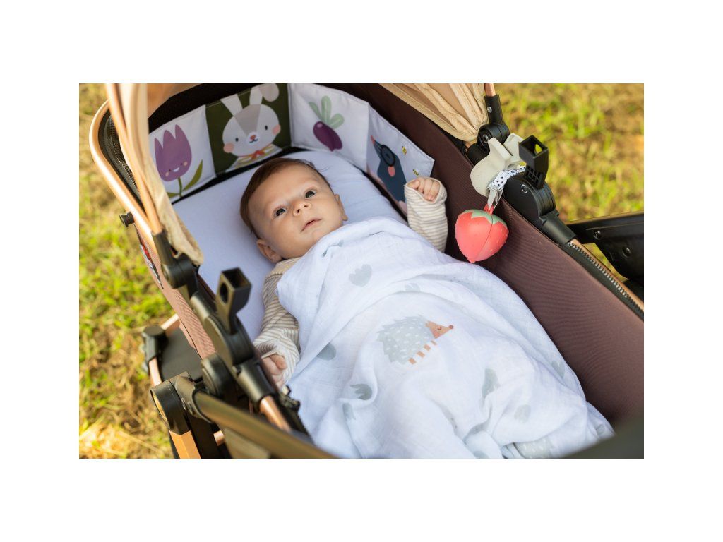 Sadu tvorí veľká textilná plienka, prebaľovacia podložka, dva plastové klipy, puzdro na cumlík v podobe závesnej jahôdky, hrkajúci zajačik a obojstranná textilná knižka do kočíka.