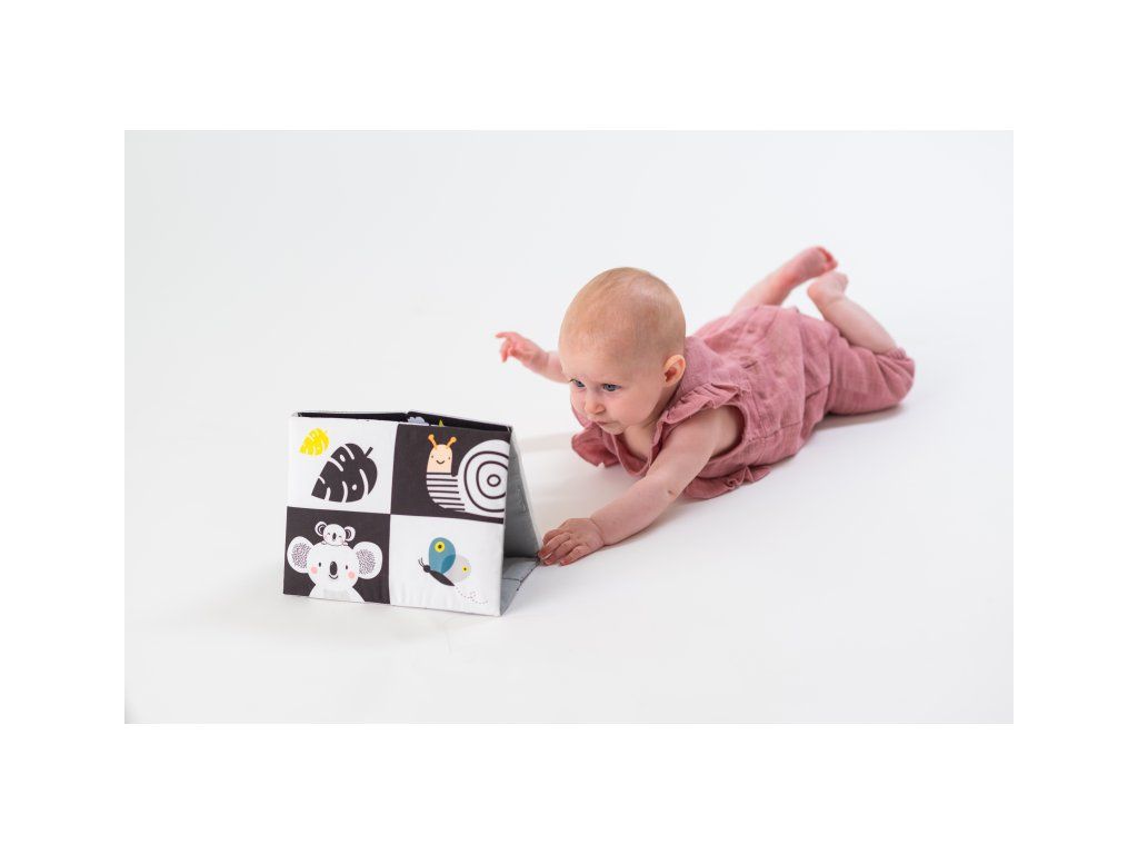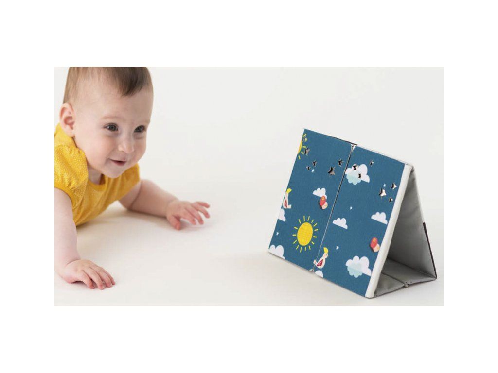 Textilná knižka v tvare stolného kalendára je ideálna pre postavenie pred dieťa pri hre na brušku. Neodolateľné vysoko kontrastné obrázky a bezpečné veľké zrkadlo upútajú pozornosť dieťaťa a pomáhajú tak zabaviť dieťa pri hre na brušku.