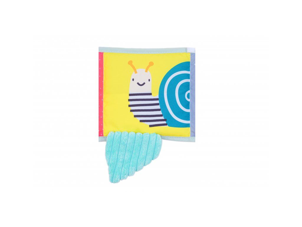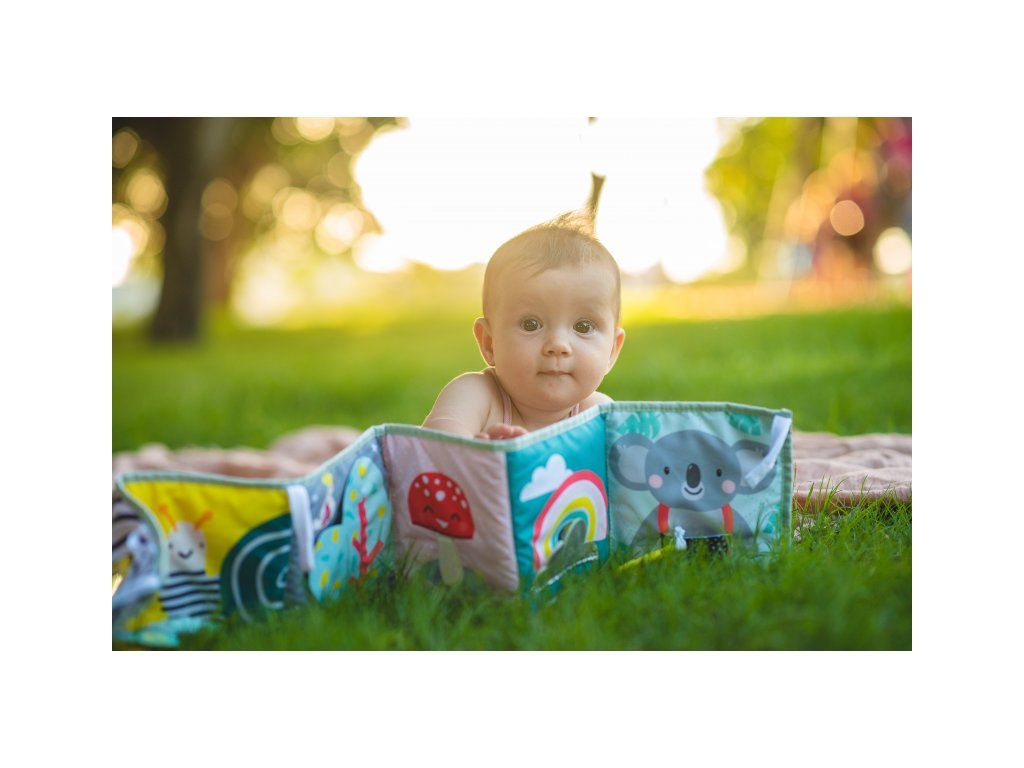 - Od 3 mesiacov: strana s farebnými obrázkami a rôznorodými textúrami na skúmanie, ktoré podporujú rozvoj zmyslov a jemnej motoriky dieťaťa.