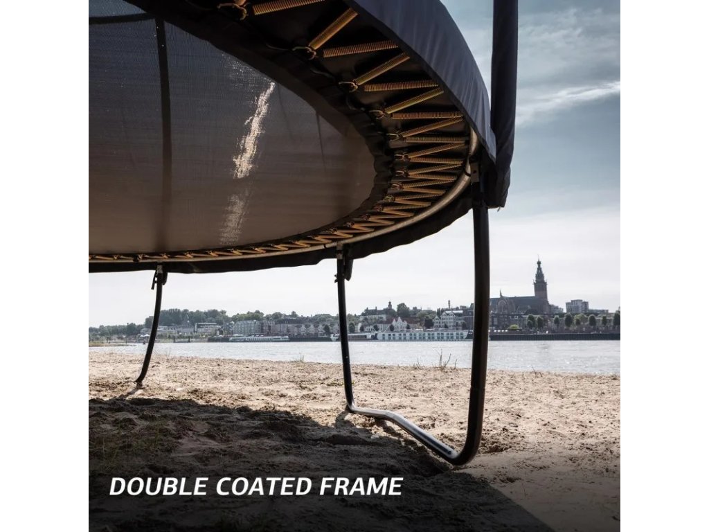 Kvalita: vysoký počet silných pružín (o 30% pružín viac v porovnaní so štandardnými trampolínami!) sa vďaka novému postupu nasadzuje pri montáži oveľa ľahšie (červené oko pružiny na červenú značku na ráme). Pružiny sú navyše opatrené veľmi odolným zinkovaním, ktoré zaisťuje vynikajúce antikorózne vlastnosti.