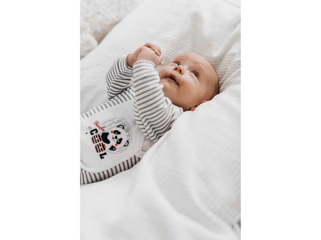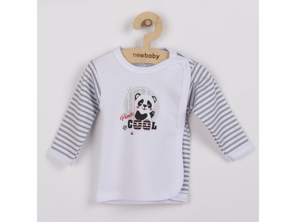 Bavlnená dojčenská košieľka New Baby Panda pre bábätká. Detská košieľka má rukávky a zadnú stranu celopotlačenú modernými pruhymi a predná strana je zdobená obrázkom rozprávkovej pandy a nápisom COOL. Praktické zapínanie na cvočky na ramienku a bočnej strane uľahčuje obliekanie a prebaľovanie. Košieľka s moderným dizajnom je vhodná pre dievčatká aj chlapčekov. Zloženie: 100% bavlna.Dodatočné parametre